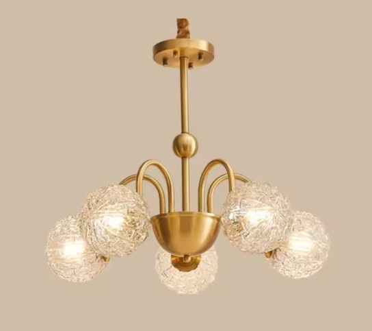 Світлодіодна люстра Мозаїка 5007 виконана в сучасному стилі із золотистою металевою основою та абажурами, які виглядають нерівними кулями зі скла. Скляні абажури мають унікальну текстуру, що нагадує крижаний зразок або мозаїку, що розсіює світло, створюючи ефектний візуальний вигляд і м'яке освітлення. Конструкція люстри має центральний стовп, від якого відходять дугоподібні елементи, на кінцях яких розташовані абажури. Такий тип освітлення чудово виглядатиме в сучасному інтер'єрі, додаючи розкоші і теплого світла в приміщення.