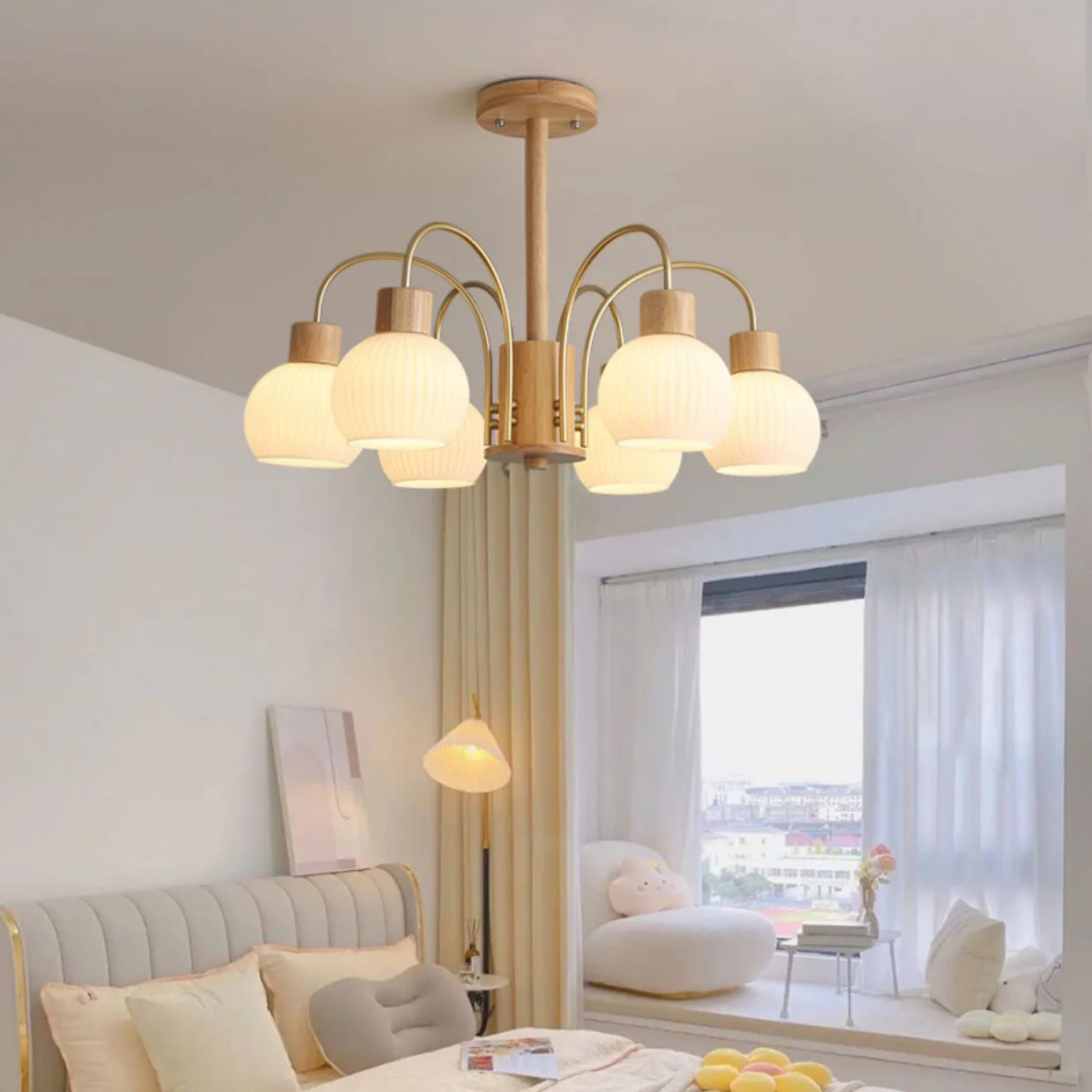 Світлодіодна люстра Медуза 5043 складається з центральної дерев'яної основи, від якої радіально відходять плавні вигнуті золотисті руки, на кінцях кожної руки розташовані світильники з матових скляних абажурів м'якого білого кольору із затишним відтінком. Абажури мають форму, що нагадує цибулини або морські шари, що надає дизайну нотки вінтажу та класики.