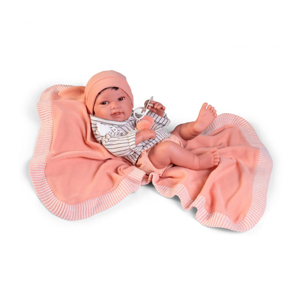 Познайомтеся з неймовірно реалістичним новонародженим пупсом Antonio Juan - милим хлопчиком заввишки 42 см. Ця лялька преміум-класу створена для того, щоб радувати дітей і колекціонерів. Її приголомшлива деталізація включає м'який вініл з додаванням силікону, ретельно опрацьовані риси обличчя, пухкі пальчики, акуратні складочки на тілі та блискучі нігтики.