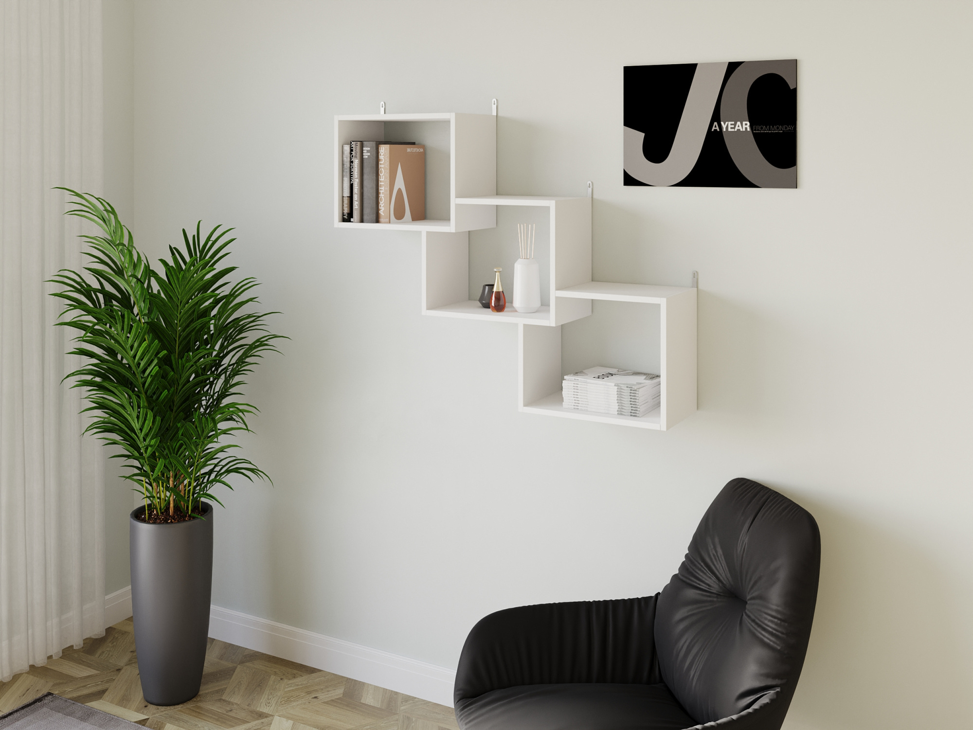 Настінна полиця FT-10 — це яскравий елемент інтер’єру, що поєднує оригінальний геометричний дизайн і функціональність. Конструкція складається з трьох однакових прямокутних секцій, з’єднаних між собою по діагоналі, створюючи виразну візуальну динаміку. Полиця стане не лише зручним місцем для зберігання речей, а й декоративним акцентом у будь-якому приміщенні.