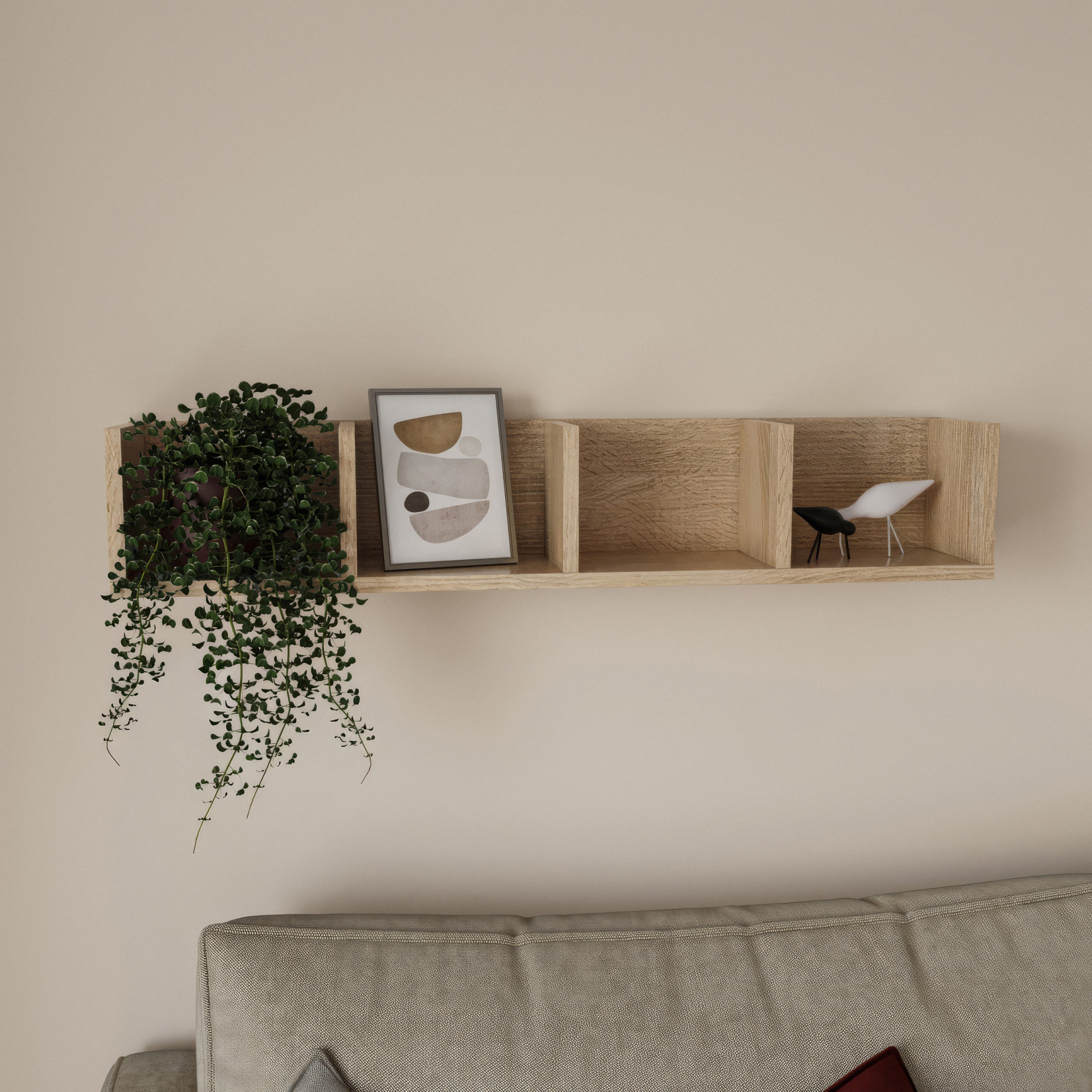 Настінна полиця GT-31 — це лаконічне й практичне рішення для зберігання та декору. Модель складається з чотирьох однакових секцій, розташованих в одну лінію, що створює строгий ритм і гармонійно вписується у сучасний інтер’єр. Полиця ідеально підходить для розміщення книг, аксесуарів, свічок, декору або фоторамок.