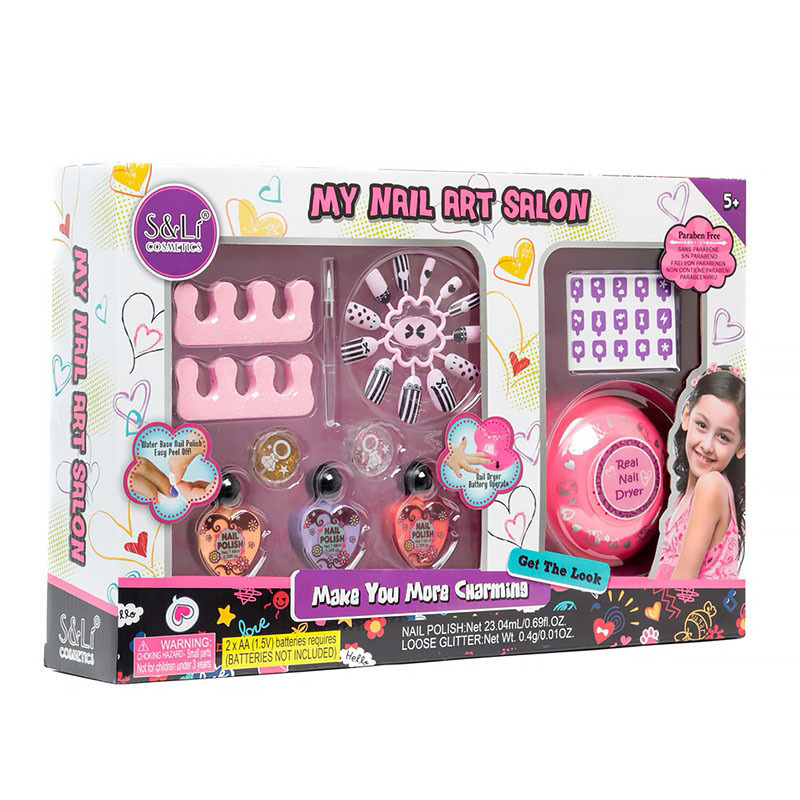 Набор детской косметики S&Li S22640 «My Nail Art Salon» - мечта каждой современной девочки Какая девочка в детстве не мечтала об идеальном маникюре? Красивые узоры, блестящее покрытие, сверкающие стразы на ногтях – все это сильно привлекает маленьких модниц. В современном мире каждая третья девчонка мечтает о профессии мастера ногтевого сервиса и теперь есть такая возможность, чтобы попробовать это в реальности, не дожидаясь взрослого возраста и примерить на себя еще в ранние годы роль специалиста по покрытию ногтей прямо сейчас. S&Li создали игровой набор детской косметики S22640 «My Nail Art Salon», который содержит все необходимые составляющие для юной леди. Этот набор станет лучшим подарком девочке, старше 5 лет. Он включает в себя все, что нужно: 2 распорки (разделители для пальцев ног), блестки, стразы, три вида лака, лампа УФ, которая работает от двух батареек типа АА (входят в комплект), кисточка, трафареты и накладные ногти, что поможет создать неповторимый маникюр за минуты. Все запаковано в картонную коробку. Декоративная косметика от производителя S&Li гипоаллергенна, не содержит парабен (консервант, входящий в состав косметических и фармацевтических средств), что обеспечивает безопасную игру, так как материалы нетоксичны и безвредны для кожи маленьких леди. Этим комплектом можно играть самой или с подружками, задействуя все средства, входящие в него для чудесного дизайна ноготков. Такие игры развивают воображение, креативность, творческие навыки, мелкую моторику рук, умение подбирать маникюр под общий образ, способность ухаживать за своими ручками с детства. Теперь вам не нужно ломать голову, подбирая подарок вашей дочери, внучке или племяннице. «My Nail Art Salon» - идеальное сочетание цены и качества.
