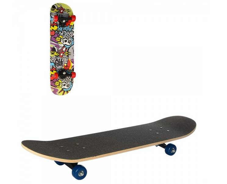Скейтборд Profi MS 0354-2 Детский прекрасное приобретение для ребенка. Ребенок легко освоит технику катания на скейте, сможет выполнять несложные трюки и прыжки. Конструкция скейтборда легкая и маневренная. Усиленная пластиковая подвеска крепится к платформе металлическими креплениями. Колеса сделаны из ПВХ, полупрозрачные. Скейтборд сделан из девяти склеенных слоев дерева. Лицевая сторона скейта покрыта крупной наждачкой, что обеспечивает хорошее сцепление с подошвой и не позволит ноге соскользнуть. На лицевой стороне наждачка и рисунок-наклейка на днище скейта.