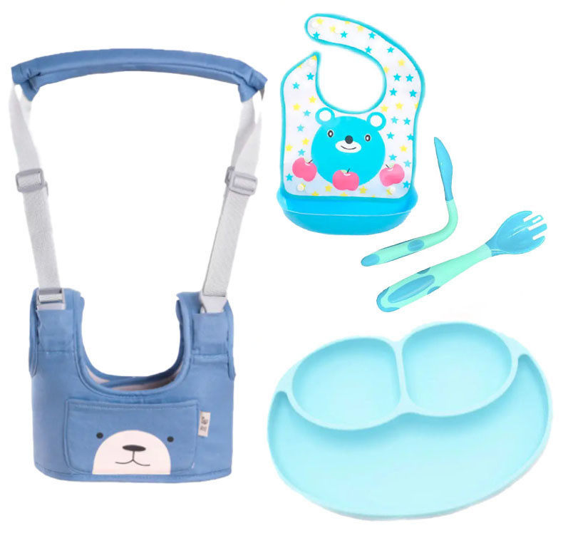 Набор детские вожжи-ходунки VOLRO с подкладками слюнявчик тарелка и ложка-вилка Голубой (vol-1971)