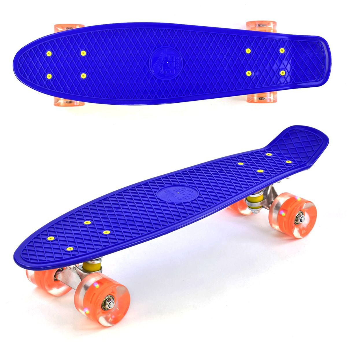 Пенни Борд со светящимися колёсами. Легкая дека сделана из прочного формованного пластика. Имеет противоскользящую поверхность. Длинна деки - 55 см, ширина - 14,5 см. Колёса PU, со светом, d=6 см. Подвески: алюминий. Максимальная нагрузка 70-80 кг.