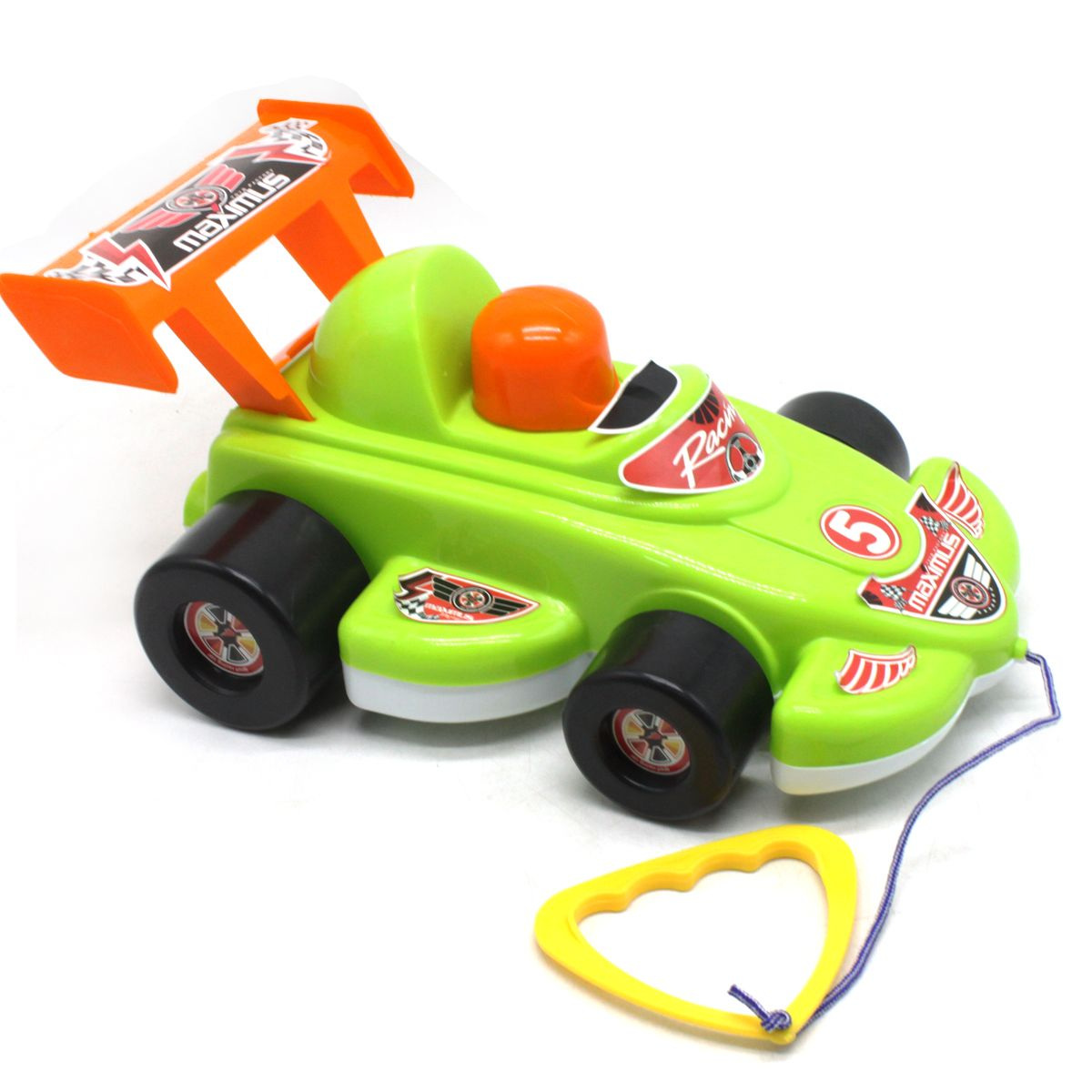 Пластиковая яркая гоночная машинка станет отличным подарком вашему ребёнку. Размер игрушки 30х18,5х16 см. Диаметр колес 5,5 см. Выполнен из прочного и безопасного пластика. У игрушки есть веревочка с ручкой, за которую можно возить игрушку за собой Для детей от 3-х лет.