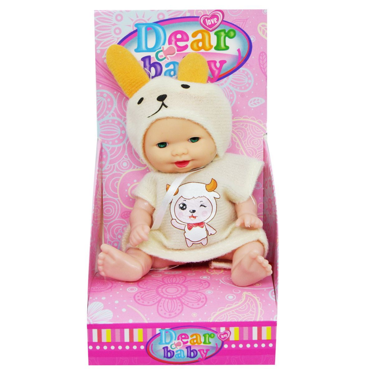 Маленький милый пупсик с забавном костюмчике в виде зверушки. Имеет звуковые эффекты - при нажатии на кнопочку говорит "мама", смеется и плачет. Подвижные кучки, ноги и голова. Выполнено из качественных и прочных материалов, будет прекрасным подарком ребенку от 3-х лет.