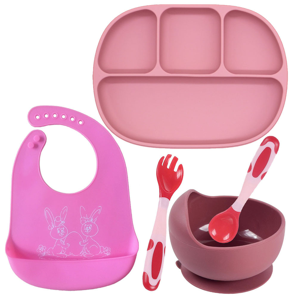 Набор силиконовой посуды, разработан и создан с учётом всех требований мам для кормления детей от 1го месяца до 5 лет, состоит из 5 предметов: 1.Четырех-секционная силиконовая тарелка 2.Вилка 3.Ложка 4.Тарелка для супа 5.Силиконовый слюнявчик Набор посуды из силикона обладает рядом преимуществ и достоинств перед другими видами детской посуды: 1.Посуда из пищевого силикона не бьется и не имеет запаха 2. Представленный набор посуды имеет нужные изгибы для удобства при эксплуатации 3.Посуда изготовлена из пищевого силикона соответсвует всем международным стандартам качества 4.Посуду можно стерилизовать и мыть в посудомоечной машине 5.Силиконовую посуду можно использовать в духовке, в пароварке или в СВЧ 6.Силиконовая тарелка: секционная снабжена присоской, что обеспечивает устойчивость посуды на столике для кормления или на любой другой гладкой и чистой поверхности. 7.Вся посуда сохраняет свой первоначальный вид в течении всего срока эксплуатации. Тарелочка круглая силиконовая на присоске ее достаточно, как для начала первого прикорма так и для последующего кормления ребёнка. Тарелка снабжена присоской на дне и не скользит по поверхности столика, - это особенно удобно когда малыш захочет учиться кушать самостоятельно, но также есть выступ, что бы легко отцепить липучку. В свою очередь, завышенный бортик тарелки поможет набрать еду маленькими, ещё не умелыми ручками. Термочувствительная ложка/вилка меняющая форму. Ложку или вилку можно изогнуть и она останется в той форме, которую вы ей придадите, это даст возможность быстрее ребенку привыкнуть к новым самостоятельным движениям. Столовые приборы имеют отличительную особенность, - чувствительны к температуре, чтобы избежать ожогов. Когда температура пищи превышает 40 ℃, головка ложки/вилки становится белой, а когда температура ниже 40 ℃, цвет восстанавливается. Также не мало важно, они идут в пластиковом прозрачном футляром для хранения, что очень удобно если необходимо брать с собой в дорогу. Слюнявчик - незаменимая вещь при кормлении малыша. Максимум комфорта для ребёнка и минимум уборки для родителей. Компактный и удобный в использовании для дома, детского сада, поездок, прогулок. Не требует стирки. Нагрудник достаточно протереть тряпочкой или салфеткой. Кармашек для улавливания пролитой еды отлично защищает одежду от загрязнений. Характеристики: Материал: Силикон + пищевой пластик. Легко ухаживать: можно мыть руками или в посудомоечной машине. Длина - 14,4 см (обеспечивает комфортное кормление родителями без проливания, также подходит для всех видов баночек и контейнеров) Толщина ручки (в самом широком месте 3 см) подойдет для любого возраста ребенка. Наша рекомендация: перед использованием промыть теплой водой с добавлением нейтрального моющего средства. О разнице в цвете: Все товары сделаны на натуральных фотографиях. Из-за различных мониторов и освещения при съемке, факторов окружающей среды и т. д., есть небольшая разница в цвете, которая объективна и ее нельзя избежать! Хроматическая аберрация не является проблемой качества.
