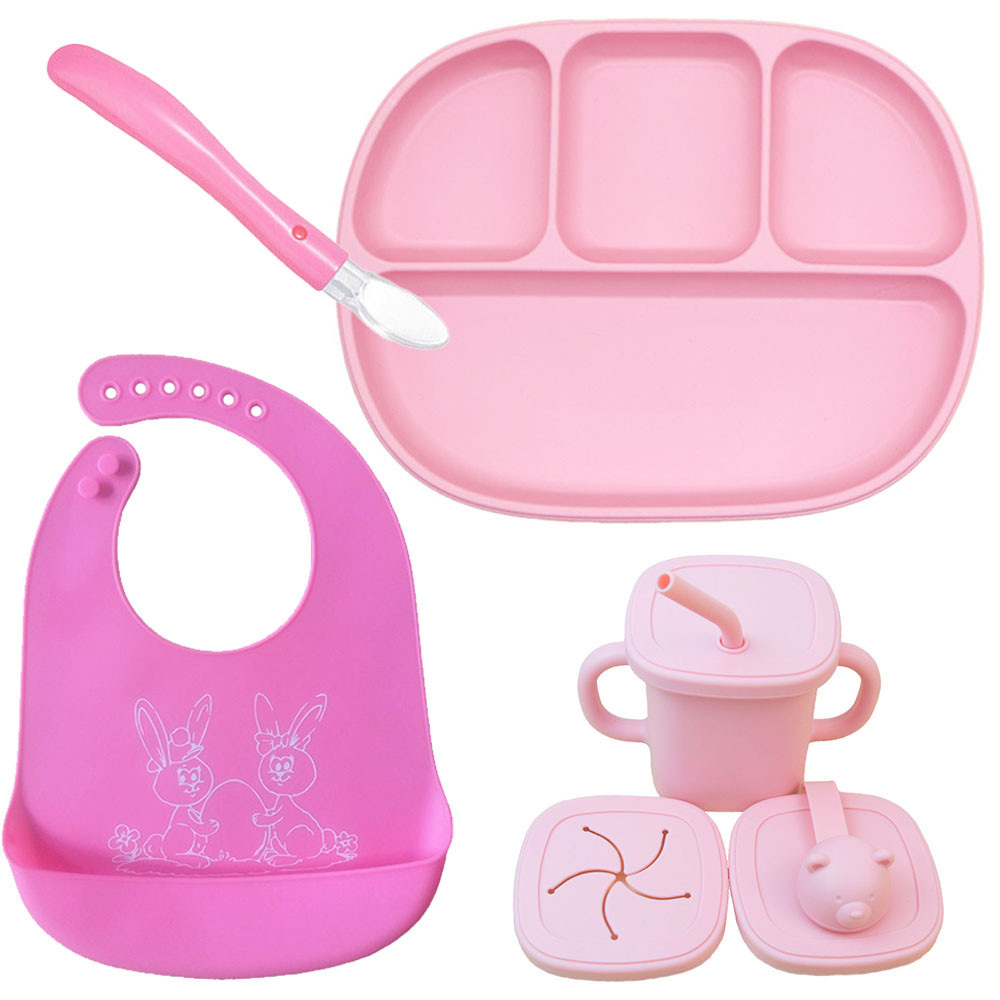 Набор силиконовой посуды, разработан и создан с учётом всех требований мам для кормления детей от 1-го месяца до 5 лет, состоит из 4 предметов: 1.Четырех-секционная силиконовая тарелка 2.Слюнявчик с регулируемой застежкой и карманом 3.Ложка в контейнере 4.Чаша со сменной крышкой для снеков Набор посуды из силикона обладает рядом преимуществ и достоинств перед другими видами детской посуды: 1.Посуда из пищевого силикона не бьется и не имеет запаха 2. Представленный набор посуды имеет нужные изгибы для удобства при эксплуатации 3.Посуда изготовлена из пищевого силикона соответствует всем международным стандартам качества 4.Посуду можно стерилизовать и мыть в посудомоечной машине 5.Силиконовую посуду можно использовать в духовке, в пароварке или в СВЧ 6.Силиконовые тарелки: секционная и круглая снабжены присосками, что обеспечивает устойчивость посуды на столике для кормления или на любой другой гладкой и чистой поверхности. 7.Вся посуда сохраняет свой первоначальный вид в течении всего срока эксплуатации. Секционная силиконовая тарелка с четырех секций на присоске. В ней можно готовить пищу для ребёнка, совмещать разные виды продуктов по консистенции и по температуре. Тарелка снабжена присоской на дне и не скользит по поверхности столика, - это особенно удобно когда малыш захочет учиться кушать самостоятельно, но также есть выступ, что бы легко отцепить липучку. Слюнявчик - незаменимая вещь при кормлении малыша. Максимум комфорта для ребёнка и минимум уборки для мамы. Компактный и удобный в использовании для дома, детского сада, поездок, прогулок. Не требует стирки. Нагрудник достаточно протереть тряпочкой или салфеткой. Кармашек для улавливания пролитой еды отлично защищает одежду от загрязнений. Ложка с данного набора не повредят нежные ещё не окрепшими десна и первые зубики малыша даже при нажатии на столовые предметы. Особая форма и небольшой объём необходимы для плавного перехода малыша от груди к ложке. Силиконовый поильник для детей 3в1 чашка силиконовая с ручками, снечница, поильник с трубочкой. Данный поильник можно видоизменить благодаря крышкам: это может быть Обучающий поильник, затем когда малыш подрастёт, он может быть Снек-стаканчиком - это как непроливайка для напитков, только непросыпайка для печенек, ягод, фруктов и многого другого. А когда малыш научится пить и кушать самостоятельно поильник станет Универсальной чашкой для разных напитков. Изделие изготовлено из 100% пищевого силикона и пригодно, как для горячих так и для холодных напитков. Наша рекомендация: перед использованием промыть теплой водой с добавлением нейтрального моющего средства. О разнице в цвете: Все товары сделаны на натуральных фотографиях. Из-за различных мониторов и освещения при съемке, факторов окружающей среды и т. д., есть небольшая разница в цвете, которая объективна и ее нельзя избежать! Хроматическая аберрация не является проблемой качества.