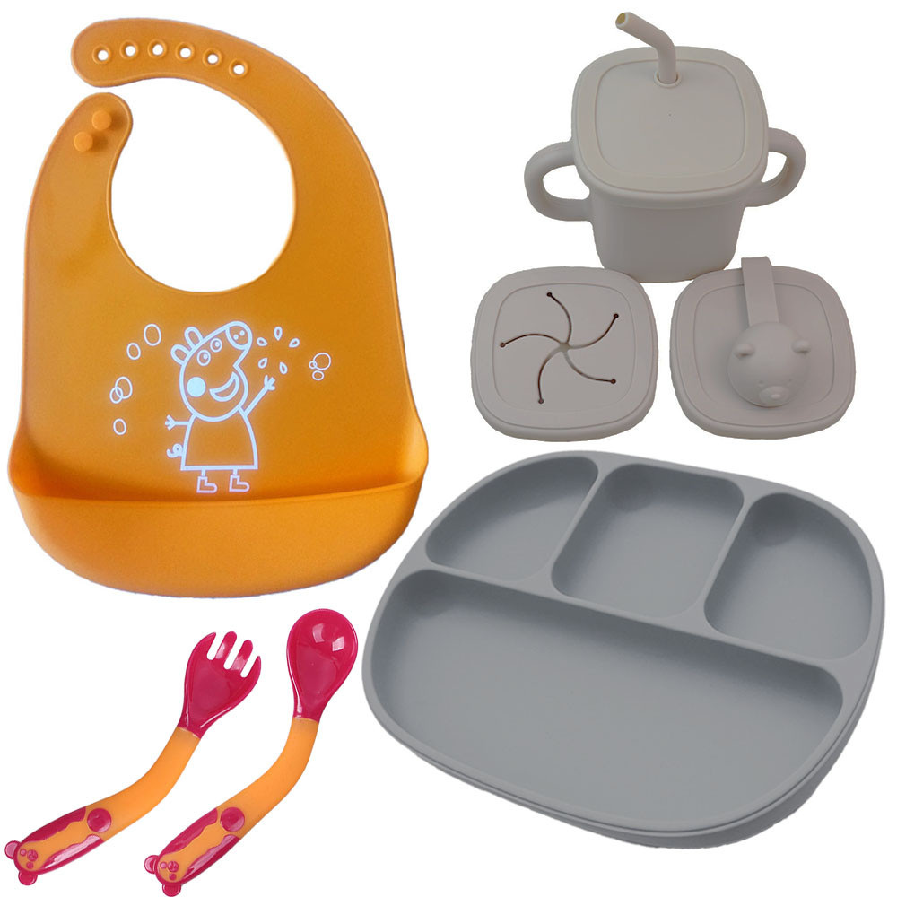 Набор силиконовой посуды, разработан и создан с учётом всех требований мам для кормления детей от 1-го месяца до 5 лет, состоит из 5 предметов: 1.Четырех-секционная силиконовая тарелка 2.Слюнявчик с регулируемой застежкой и карманом 3.Ложка 4.Вилка 5.Чаша со сменной крышкой для снеков Набор посуды из силикона обладает рядом преимуществ и достоинств перед другими видами детской посуды: 1.Посуда из пищевого силикона не бьется и не имеет запаха 2. Представленный набор посуды имеет нужные изгибы для удобства при эксплуатации 3.Посуда изготовлена из пищевого силикона соответствует всем международным стандартам качества 4.Посуду можно стерилизовать и мыть в посудомоечной машине 5.Силиконовую посуду можно использовать в духовке, в пароварке или в СВЧ 6.Силиконовые тарелки: секционная и круглая снабжены присосками, что обеспечивает устойчивость посуды на столике для кормления или на любой другой гладкой и чистой поверхности. 7.Вся посуда сохраняет свой первоначальный вид в течении всего срока эксплуатации. Секционная силиконовая тарелка с четырех секций на присоске. В ней можно готовить пищу для ребёнка, совмещать разные виды продуктов по консистенции и по температуре. Тарелка снабжена присоской на дне и не скользит по поверхности столика, - это особенно удобно когда малыш захочет учиться кушать самостоятельно, но также есть выступ, что бы легко отцепить липучку. Слюнявчик - незаменимая вещь при кормлении малыша. Максимум комфорта для ребёнка и минимум уборки для мамы. Компактный и удобный в использовании для дома, детского сада, поездок, прогулок. Не требует стирки. Нагрудник достаточно протереть тряпочкой или салфеткой. Кармашек для улавливания пролитой еды отлично защищает одежду от загрязнений. Ложка и вилка с данного набора не повредят нежные ещё не окрепшими десна и первые зубики малыша даже при нажатии на столовые предметы. Особая форма и небольшой объём необходимы для плавного перехода малыша от груди к ложке. Силиконовый поильник для детей 3в1 чашка силиконовая с ручками, снечница, поильник с трубочкой. Данный поильник можно видоизменить благодаря крышкам: это может быть Обучающий поильник, затем когда малыш подрастёт, он может быть Снек-стаканчиком - это как непроливайка для напитков, только непросыпайка для печенек, ягод, фруктов и многого другого. А когда малыш научится пить и кушать самостоятельно поильник станет Универсальной чашкой для разных напитков. Изделие изготовлено из 100% пищевого силикона и пригодно, как для горячих так и для холодных напитков. Наша рекомендация: перед использованием промыть теплой водой с добавлением нейтрального моющего средства. О разнице в цвете: Все товары сделаны на натуральных фотографиях. Из-за различных мониторов и освещения при съемке, факторов окружающей среды и т. д., есть небольшая разница в цвете, которая объективна и ее нельзя избежать! Хроматическая аберрация не является проблемой качества.