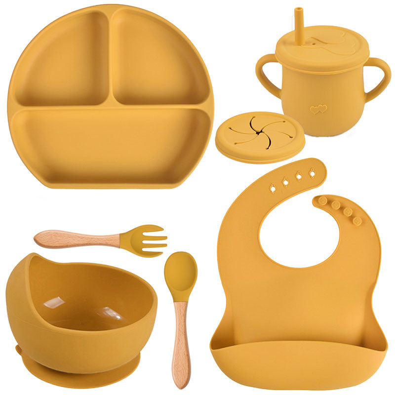 Набор силиконовой посуды, разработан и создан с учётом всех требований мам для кормления детей от 4х месяцев до 5 лет, состоит из предметов: 1. Трёхсекционная силиконовая тарелка 2. Круглая тарелка на присоске для первых блюд 3. Силиконовый слюнявчик с регулируемой застежкой и карманом 4. Вилка 5. Ложка 6. Поильник-непроливайка Набор посуды из силикона обладает рядом преимуществ и достоинств перед другими видами детской посуды: 1.Посуда из пищевого силикона не бьется и не имеет запаха 2. Представленный набор посуды имеет нужные изгибы для удобства при эксплуатации 3.Посуда изготовлена из пищевого силикона и соответсвует всем международным стандартам качества 4.Посуду можно стерилизовать и мыть в посудомоечной машине 5.Силиконовую посуду можно использовать в духовке, в пароварке или в СВЧ 6.Силиконовые тарелки: секционная и круглая снабжены присосками, что обеспечивает устойчивость посуды на столике для кормления или на любой другой гладкой и чистой поверхности. 7.Вся посуда сохраняет свой первоначальный вид в течении всего срока эксплуатации. Секционная силиконовая тарелка с трех секций на присоске. В ней можно готовить пищу для ребёнка, совмещать разные виды продуктов по консистенции и по температуре. Тарелка снабжена присоской на дне и не скользит по поверхности столика - это особенно удобно когда малыш захочет учиться кушать самостоятельно, но также есть выступ, что бы легко отцепить липучку. Тарелочка круглая силиконовая на присоске, ее достаточно, как для начала первого прикорма так и для последующего кормления ребёнка. Слюнявчик - незаменимая вещь при кормлении малыша. Максимум комфорта для ребёнка и минимум уборки для мамы. Компактный и удобный в использовании для дома, детского сада, поездок, прогулок. Не требует стирки. Нагрудник достаточно протереть тряпочкой или салфеткой. Кармашек для улавливания пролитой еды отлично защищает одежду от загрязнений. Набор столовых приборов из пищевого силикона с деревянной ручкой - это идеальные решение для начала прикорма. Удобные и аккуратные ложечка и вилочка с данного набора не повредят нежные ещё не окрепшими десна и первые зубики малыша даже при нажатии на столовые предметы. Деревянные ручки: Эргономичные деревянные ручки удобно держать как малышу, так и взрослому. Дерево приятное на ощупь и не скользит. Силиконовый поильник для детей 3в1 чашка силиконовая с ручками, снечница, поильник с трубочкой. Данный поильник можно видоизменить благодаря специальным крышкам: это может быть Обучающий поильник, затем когда малыш подрастёт, он может быть Снек-стаканчиком - это как непроливайка для напитков, только непросыпайка для печенек, ягод, фруктов и многого другого. А когда малыш научится пить и кушать самостоятельно поильник станет Универсальной чашкой для разных напитков. Изделие изготовлено из 100% пищевого силикона и пригодно, как для горячих так и для холодных напитков. Наша рекомендация: перед использованием промыть теплой водой с добавлением нейтрального моющего средства. О разнице в цвете: Все товары сделаны на натуральных фотографиях. Из-за различных мониторов и освещения при съемке, факторов окружающей среды и т. д., есть небольшая разница в цвете, которая объективна и ее нельзя избежать! Хроматическая аберрация не является проблемой качества.