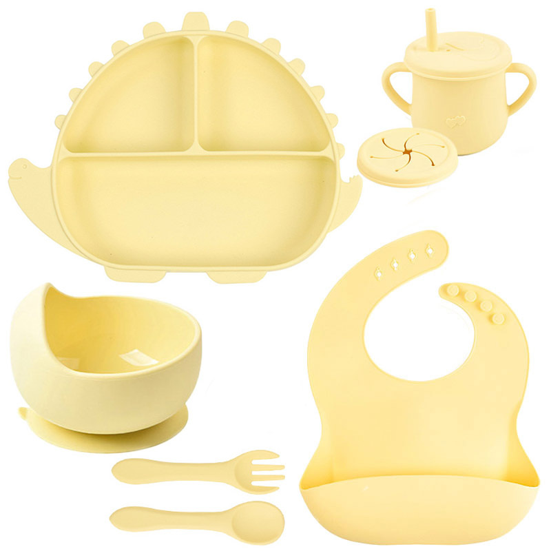 Набор силиконовой посуды, разработан и создан с учётом всех требований мам для кормления детей, состоит из предметов: 1. Трёхсекционная силиконовая тарелка 2. Круглая тарелка на присоске для первых блюд 3. Силиконовый слюнявчик с регулируемой застежкой и карманом 4. Вилка 5. Ложка 6. Поильник-непроливайка Набор посуды из силикона обладает рядом преимуществ и достоинств перед другими видами детской посуды: 1.Посуда из пищевого силикона не бьется и не имеет запаха 2. Представленный набор посуды имеет нужные изгибы для удобства при эксплуатации 3.Посуда изготовлена из пищевого силикона и соответсвует всем международным стандартам качества 4.Посуду можно стерилизовать и мыть в посудомоечной машине 5.Силиконовую посуду можно использовать в духовке, в пароварке или в СВЧ 6.Силиконовые тарелки: секционная и круглая снабжены присосками, что обеспечивает устойчивость посуды на столике для кормления или на любой другой гладкой и чистой поверхности. 7.Вся посуда сохраняет свой первоначальный вид в течении всего срока эксплуатации. Секционная силиконовая тарелка с трех секций на присоске в форме динозавра. В ней можно готовить пищу для ребёнка, совмещать разные виды продуктов по консистенции и по температуре. Тарелка снабжена присоской на дне и не скользит по поверхности столика - это особенно удобно когда малыш захочет учиться кушать самостоятельно, но также есть выступ, что бы легко отцепить липучку. Тарелочка круглая силиконовая на присоске, ее достаточно, как для начала первого прикорма так и для последующего кормления ребёнка. Слюнявчик - незаменимая вещь при кормлении малыша. Максимум комфорта для ребёнка и минимум уборки для мамы. Компактный и удобный в использовании для дома, детского сада, поездок, прогулок. Не требует стирки. Нагрудник достаточно протереть тряпочкой или салфеткой. Кармашек для улавливания пролитой еды отлично защищает одежду от загрязнений. Набор столовых приборов из пищевого силикона это идеальные вилочка и ложечка для начала прикорма. Удобные и аккуратные ложечка и вилочка с данного набора не повредят нежные ещё не окрепшими десна и первые зубики малыша даже при нажатии на столовые предметы. Особая форма и небольшой объём необходимы для плавного перехода малыша от груди к ложке. Силиконовый поильник для детей 3в1 чашка силиконовая с ручками, снечница, поильник с трубочкой. Данный поильник можно видоизменить благодаря специальным крышкам: это может быть Обучающий поильник, затем когда малыш подрастёт, он может быть Снек-стаканчиком - это как непроливайка для напитков, только непросыпайка для печенек, ягод, фруктов и многого другого. А когда малыш научится пить и кушать самостоятельно поильник станет Универсальной чашкой для разных напитков. Изделие изготовлено из 100% пищевого силикона и пригодно, как для горячих так и для холодных напитков. Наша рекомендация: перед использованием промыть теплой водой с добавлением нейтрального моющего средства. О разнице в цвете: Все товары сделаны на натуральных фотографиях. Из-за различных мониторов и освещения при съемке, факторов окружающей среды и т. д., есть небольшая разница в цвете, которая объективна и ее нельзя избежать! Хроматическая аберрация не является проблемой качества.