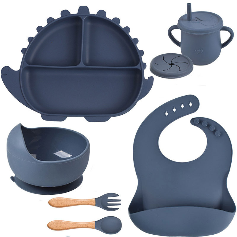Набор силиконовой посуды, разработан и создан с учётом всех требований мам для кормления детей, состоит из предметов: 1. Трёхсекционная силиконовая тарелка 2. Круглая тарелка на присоске для первых блюд 3. Силиконовый слюнявчик с регулируемой застежкой и карманом 4. Вилка 5. Ложка 6. Поильник-непроливайка Набор посуды из силикона обладает рядом преимуществ и достоинств перед другими видами детской посуды: 1.Посуда из пищевого силикона не бьется и не имеет запаха 2. Представленный набор посуды имеет нужные изгибы для удобства при эксплуатации 3.Посуда изготовлена из пищевого силикона и соответсвует всем международным стандартам качества 4.Посуду можно стерилизовать и мыть в посудомоечной машине 5.Силиконовую посуду можно использовать в духовке, в пароварке или в СВЧ 6.Силиконовые тарелки: секционная и круглая снабжены присосками, что обеспечивает устойчивость посуды на столике для кормления или на любой другой гладкой и чистой поверхности. 7.Вся посуда сохраняет свой первоначальный вид в течении всего срока эксплуатации. Секционная силиконовая тарелка с трех секций на присоске в форме динозавра. В ней можно готовить пищу для ребёнка, совмещать разные виды продуктов по консистенции и по температуре. Тарелка снабжена присоской на дне и не скользит по поверхности столика - это особенно удобно когда малыш захочет учиться кушать самостоятельно, но также есть выступ, что бы легко отцепить липучку. Тарелочка круглая силиконовая на присоске, ее достаточно, как для начала первого прикорма так и для последующего кормления ребёнка. Слюнявчик - незаменимая вещь при кормлении малыша. Максимум комфорта для ребёнка и минимум уборки для мамы. Компактный и удобный в использовании для дома, детского сада, поездок, прогулок. Не требует стирки. Нагрудник достаточно протереть тряпочкой или салфеткой. Кармашек для улавливания пролитой еды отлично защищает одежду от загрязнений. Набор столовых приборов из пищевого силикона с деревянной ручкой - это идеальные решение для начала прикорма. Удобные и аккуратные ложечка и вилочка с данного набора не повредят нежные ещё не окрепшими десна и первые зубики малыша даже при нажатии на столовые предметы. Деревянные ручки: Эргономичные деревянные ручки удобно держать как малышу, так и взрослому. Дерево приятное на ощупь и не скользит. Силиконовый поильник для детей 3в1 чашка силиконовая с ручками, снечница, поильник с трубочкой. Данный поильник можно видоизменить благодаря специальным крышкам: это может быть Обучающий поильник, затем когда малыш подрастёт, он может быть Снек-стаканчиком - это как непроливайка для напитков, только непросыпайка для печенек, ягод, фруктов и многого другого. А когда малыш научится пить и кушать самостоятельно поильник станет Универсальной чашкой для разных напитков. Изделие изготовлено из 100% пищевого силикона и пригодно, как для горячих так и для холодных напитков. Наша рекомендация: перед использованием промыть теплой водой с добавлением нейтрального моющего средства. О разнице в цвете: Все товары сделаны на натуральных фотографиях. Из-за различных мониторов и освещения при съемке, факторов окружающей среды и т. д., есть небольшая разница в цвете, которая объективна и ее нельзя избежать! Хроматическая аберрация не является проблемой качества.
