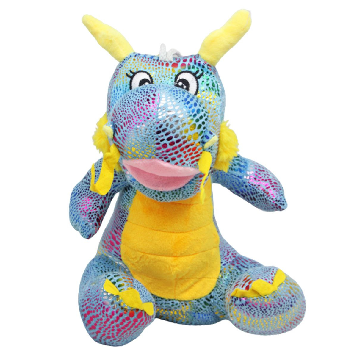 Милая мягкая игрушка в виде забавного дракончика с разноцветной блестящей чешуей. Игрушка мягкая и приятная на ощупь, выполнена из качественных материалов. Глазки вышиты на ткани. Игрушка плотно набита синтепоном и хорошо держит форму. Размер игрушки: 30 х 20 х 20 см. Игрушка будет отличным подарком ребенку любого возраста.