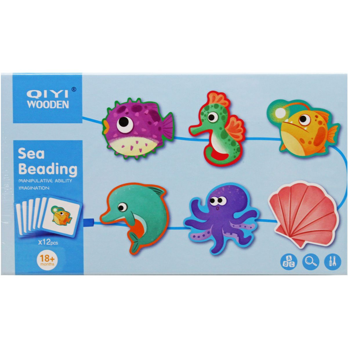 Увлекательная детская игра, суть которой состоит в том, чтобы малыш одевал фигурки на веревочку. Хорошо развивает логику и мелкую моторику рук. В наборе 12 деревянных фигурок морских зверушек и 12 карточек с их изобрадениями. Набор выполнен из качественных и безопасных материалов.