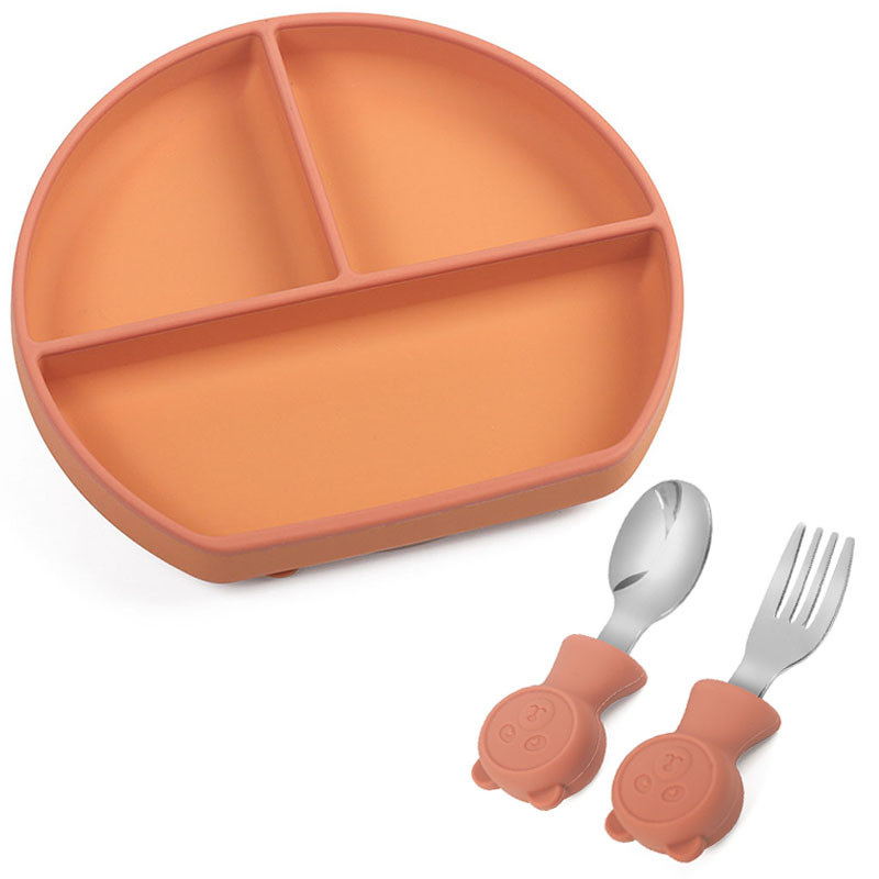 Силиконовая трехсекционная тарелка 2Life Y25 и металлические приборы Y27 Оранжевый с коричневым (v-11544)