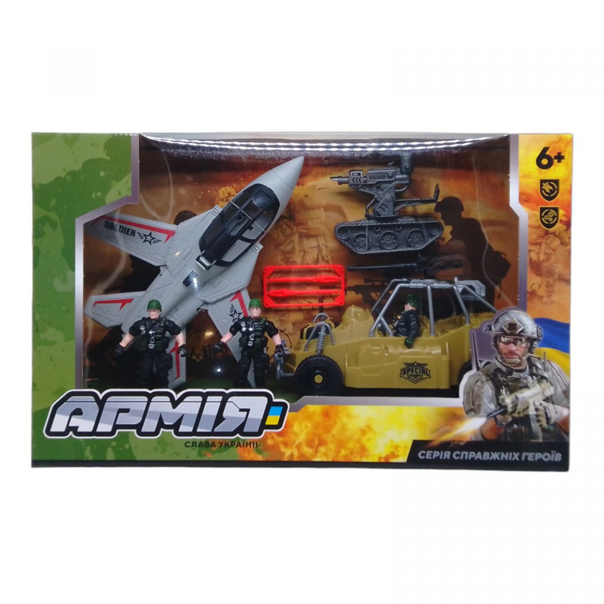 Военный набор – это интересная игрушка, которая предлагает ребенку интересный мир стратегий и ролевых игр. В комплекте представлены различные элементы, позволяющие создавать реалистичные сценарии боевых действий. В наборе есть: самолет, военный внедорожник, пушка (стреляет снарядами), 3 солдатика, снаряды. Размер фигурок – 10 см.