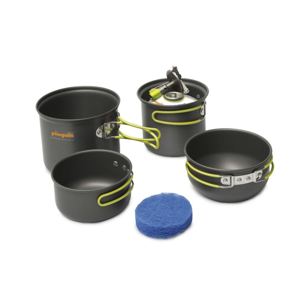 Набір алюмінієвого посуду Pinguin Double Alu- набір, який чудово підходить для приготування повноцінного обіду в мандрівках, до комплекту входять дві великі і дві маленькі каструлі з силіконовими ручками, які складаються і губка для миття. Менші каструлі можна використати в якості кришки до більших. Набір розрахований на 2-3 осіб. Шар каструль покритий анодованим алюмінієм, що надає їм вогнестійкості. Є можливість розмістити в середину набору газовий балон і пальник. Пальник і газовий балон не входять в набір посуду.