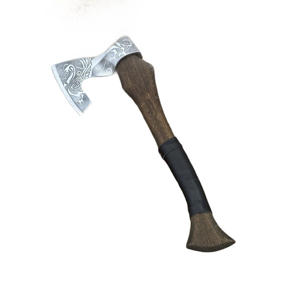 Голова топора украшена кельтскими узорами. Хорошо закалена рабочая часть лезвия. Долго держит заточку. Топорище крепиться с помощью 3х деревянных клиньев, очень надежно. Дополнительно можно приобрести чехол из натуральной кожи.