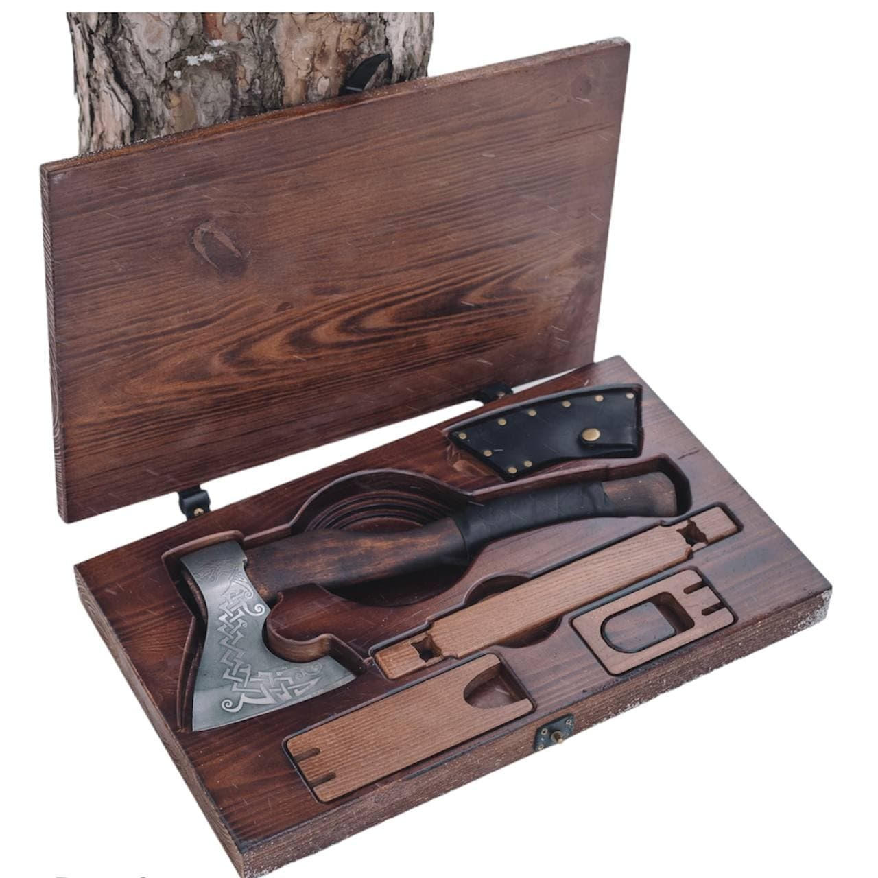Голова топора украшена скандинавскими узорами. Хорошо закалена рабочая часть лезвия. Долго держит заточку. Топорище крепиться с помощью 3х деревянных клиньев, очень надежно. В комплект идет чехол из натуральной кожи. Подарочная коробка из натурального дерева с эффектом браширования и пропитана датским маслом. В коробку так же помещается чехол для топора и разборная подставка.