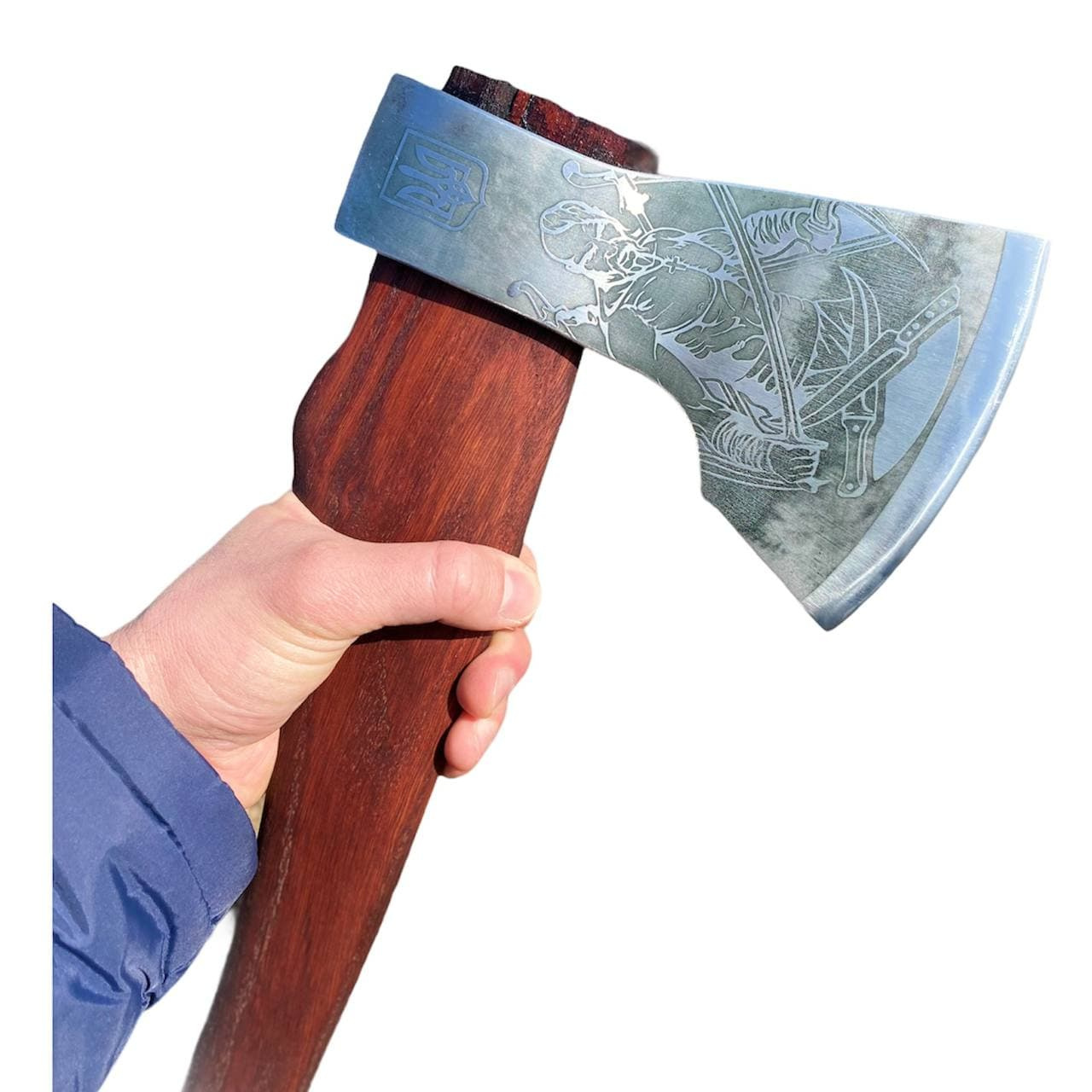 Голова топора украшена художественным травлением. Хорошо закалена рабочая часть лезвия. Долго держит заточку. Топорище крепиться с помощью крестовидного клина, очень надежно. Дополнительно можно заказать чехол на голову топора из натуральной кожи Crazy Horse/