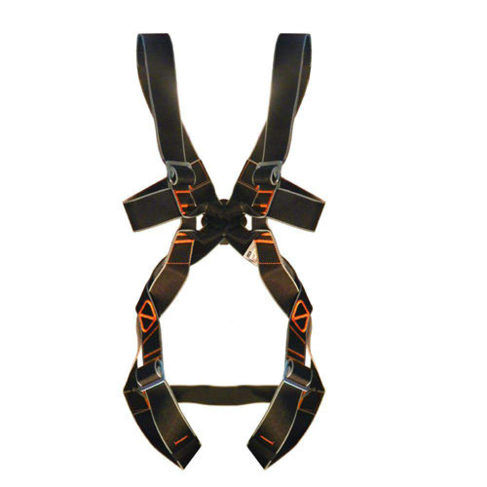 Полная система страховки. Быстро и легко одевается. Точка крепления страховочной веревки находится на уровне груди. Конструкция предотвращает переворачивание туловища.
