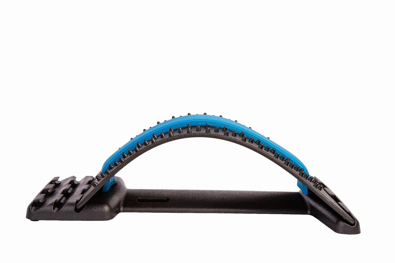 Закрепите опорную планку на выбранном уровне и поместите изделие на коврик. Более широкий край изделия должен прилегать к основанию позвоночника, чтобы планка поддерживала поясничный отдел спины, а более узкий край изделия был направлен в сторону головы. Всегда используйте изделие в правильном направлении. Сядьте спиной к изделию и медленно лягте на него, согнув колени. Постарайтесь расположить позвоночник по центру синей ленты, которая предназначена для удобного обертывания и дополнительного комфорта. При необходимости можно подложить подушку под голову, чтобы вам было комфортно, когда ваша голова не касается земли при растяжении на изделии.