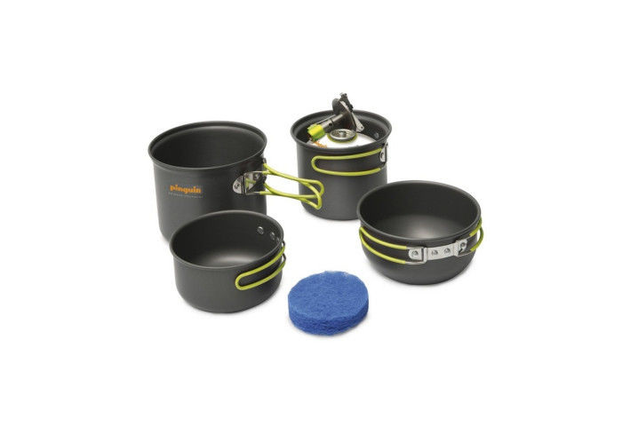 Набор алюминиевой посуды Pinguin Double Alu состоит из 2 кастрюль, 2 крышек и 1 губки для мытья. Поверхностный слой анодирован, что придает изделиям огнестойкость, износостойкость. Меньшая кастрюля помещается в большую. Комплект обеспечивает безопасную транспортировку газовых баллонов и маленькой горелки. Горелка и картридж не включены в комплект.