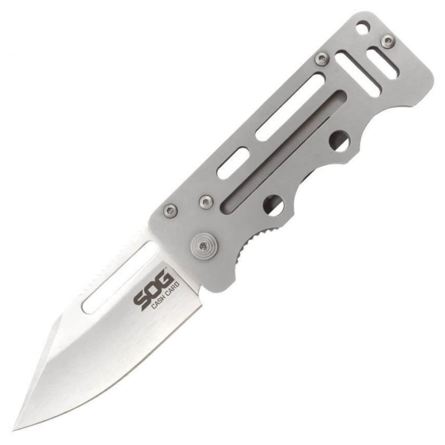 Нож SOG CashCard – легкий и компактный складной нож для ежедневного ношения. Клинок имеет форму clip-point, изготовлен из стали 8CR13MOV и извлекается с помощью отверстия в обухе. Рукоятка исполнена из нержавеющей стали и перфорирована отверстиями для снижения общего веса ножа. Карманная клипса также может использоваться как зажим для денег.