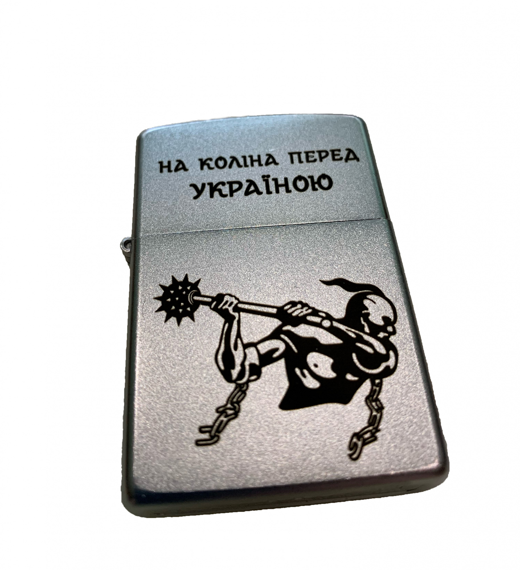 Зажигалка Zippo 205 Classic Satin Chrome - классическая бензиновая зажигалка Zippo серебристого цвета с гравировкой На коліна перед Україною. Металлический корпус имеет матовое, приятное на ощупь, хромированное покрытие обработанное по технологии сатинирования (лощения) - благодаря чему на корпусе не остается следов от пальцев. Зажигалка Zippo упакована в фирменную подарочную коробочку с логотипом Zippo.