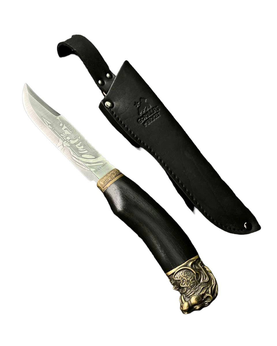 Нож отлично подойдет для любителей охоты, рыбалки и активного отдыха на природе. Рукоятка ножа изготовлена из натурального дерева твердой породы Ясень/Дуб. Украшена художественным литьем из Латуни. Клинок из практичный и надежной, нержавеющей стали 50Х14мф. При небольшой твердости клинок достаточно упругий и износостойкий. Данные ножи имеют твердость 56-58 единиц по Роквеллу. Легко затачиваются и не требуют дополнительного ухода. Кроме этого ножи устойчивы к коррозии. Рукоять пропитана влагостойким маслом. Не боится грязи и влаги. Художественное травление - это то что делает этот нож особенным и эксклюзивным. Общая длина ножа - 275 мм Материал клинка - сталь 50Х14мф Длина клинка - 131 мм Ширина клинка - 30 мм Толщина клинка - 3 мм Материал рукояти - Ясень/Дуб Длина рукояти - 144 мм Ширина рукояти - 35 мм Особенности рукояти - гарда литье из Латуни Вес ножа -200 г. *Ножны не входят в стоимость ножа