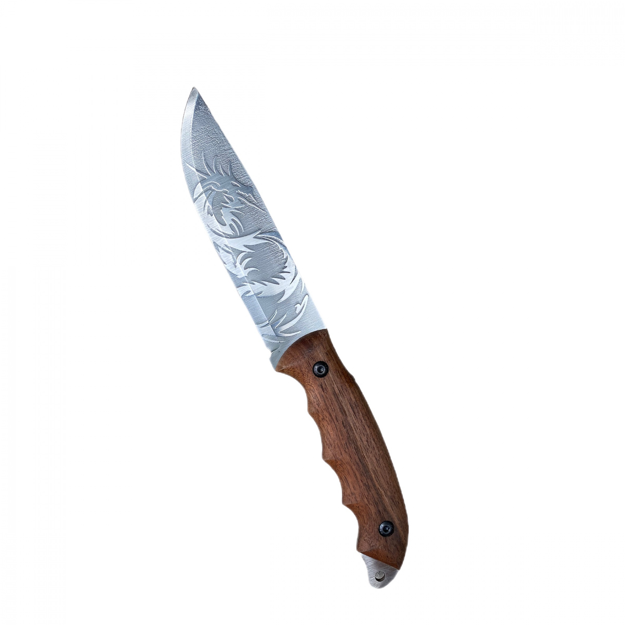 Полноразмерный нож как для ежедневного ношения так и для туристических походов, бушкрафта и лесных приключений. Конструкция ножа “Фулл Танг”. Нож имеет средние размеры. Он обладает большой прочностью и может выдерживать значительные нагрузки за счет толщины обуха и конструкции. Ножом легко выполнять лагерные работы, колоть небольшие поленья, резать ветви. Лезвие ножа сделано из нержавеющей стали 50х14мф, закаленное в 57-58 HRC и хорошо заточено. Имеет ушко. Рукоятка сделана из древесины ореха и покрыта льняным маслом. Рукоятка крепится к ножу с помощью винтов, что позволяет легко разобрать нож и прочистить его от грязи. Также данную модель ножа можно легко и быстро кастомизировать. На клинке вытравлены узоры. Размеры: Общая длина – 250 мм Длина лезвия – 130 мм Длина рукоятки – 120 мм Толщина обуха – 2,7 мм Вес – 155 грамм Сталь нержавеющая 50х14мф (твердость HRC: 57-58) Рукоять дерево Орех *ножны не входят к комплект
