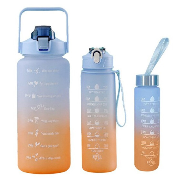 Набор спортивных бутылок 3 в 1 - это особенные бутылки с маркерами времени и мотивирующими фразами! На бутылках есть шкала-маркеры, которая показывают, сколько воды нужно выпить и к какому времени. Такие бутылки настоящие помощники для всех, кто хочет поддерживать правильный баланс воды в организме! В набор входит сразу три питьевые бутылки, которые подходят как для мужчин и женщин, так и для детей и подростков. Бутылки разным объемом- всегда можно подобрать себе или ребенку бутылку для воды к нужной ситуации.