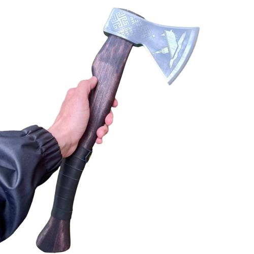 Голова топора украшена кельтскими узорами. Хорошо закалена рабочая часть лезвия. Долго держит заточку. Топорище крепиться с помощью 3х деревянных клиньев, очень надежно.