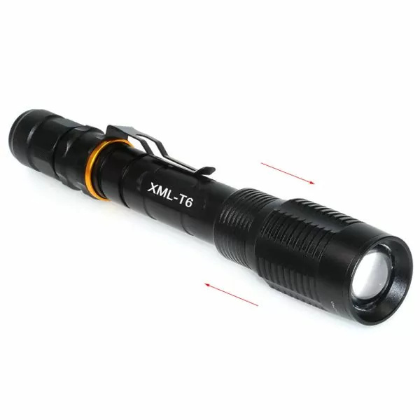 Светодиод T6 Световой поток 1000 люмен Дальность потока 600 метров Кол-во режимов 5 Режимы 25%. 50%. 100%. стробоскоп. SOS Фокусировка (Zoom) есть Материал корпуса Анодированный алюминий Водонепроницаемость есть Ударостойкость есть Питание 2 аккумулятора 18650 Комплектация фонарик / 2*акк. 18650 / ЗУ 220V / подарочная коробка   Кнопка торцевая Прорезиненная ручка нет Уплотнительные резинки есть Габаритные размеры: L195. голх35. корпх25 мм