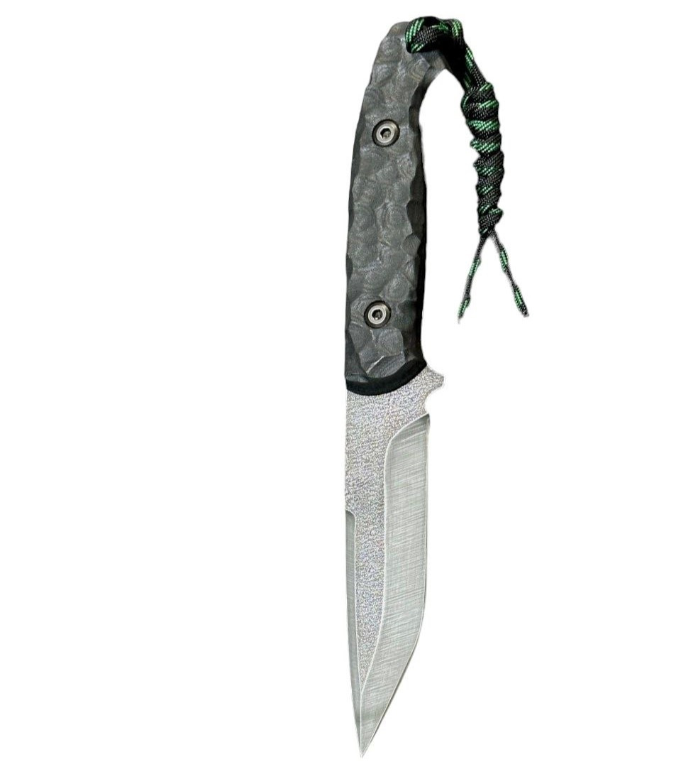 Конструкция ножа “Фулл Танг”. Нож имеет средние размеры. Он обладает большой прочностью и может выдерживать значительные нагрузки за счет толщины обуха и конструкции. Ножом легко выполнять лагерные работы, колоть небольшие поленья, резать ветви. Лезвие ножа сделано из нержавеющей стали 50х14мф, закаленное в 58 HRC и хорошо заточено. Обух украшен декоративным узором "битый камень". На клинке сделано дополнительное воронение. Темляк из паракорда. Накладки на ручку изготовлены из современного полимера Микарта. Рукоятка крепится к ножу с помощью винтов, что позволяет легко разобрать нож и прочистить его от грязи.