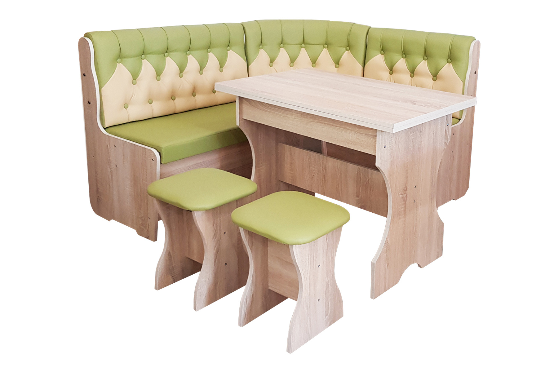 Наш кухонний комплект MossLodge є гарним рішенням для облаштування обідньої зони. Зручний кухонний куточок заощадить простір та створить комфортне місце для сімейних трапез або дружніх посиденьок. М'які сидіння та ергономічна спинка куточка забезпечать приємний відпочинок після насиченого дня. До комплекту також входять два компактні табурети, які легко прибрати під стіл, коли вони не потрібні, звільняючи додатковий простір.