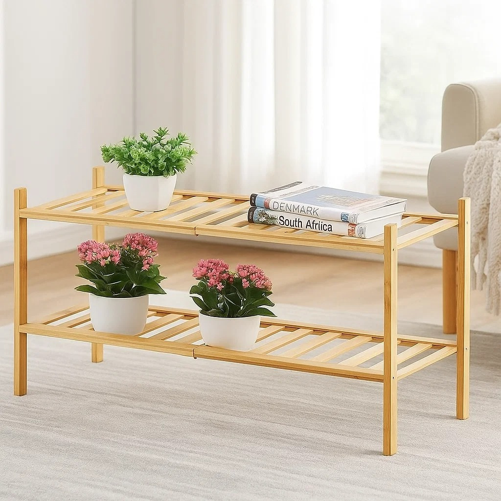 Эта двухъярусная напольная этажерка изготовлена из прочного и экологически чистого бамбука, что делает её устойчивой, долговечной и эстетически привлекательной. Натуральный цвет и минималистичный дизайн позволяют вписаться в любой интерьер, от классического до скандинавского.