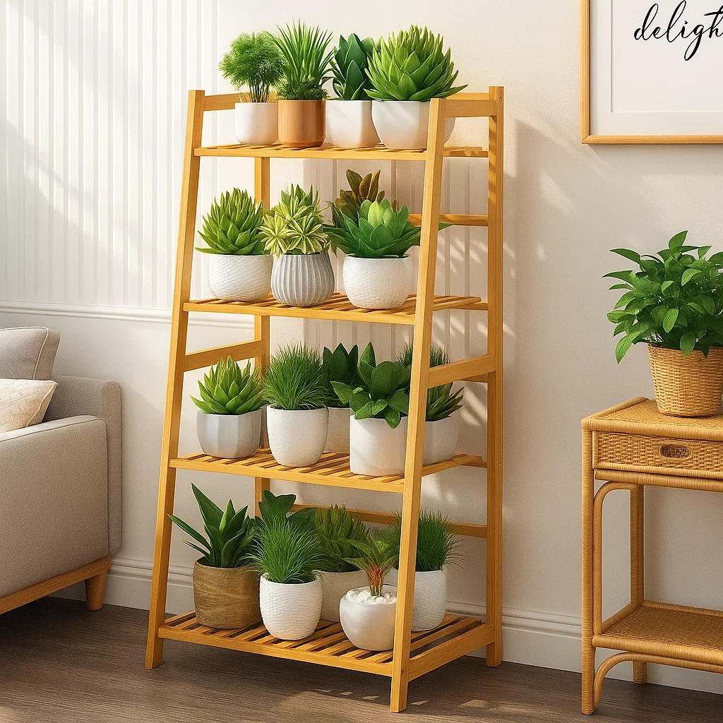 Этажерка имеет четыре яруса, расположенные с равномерным интервалом, что позволяет разместить горшки разных размеров и форм. Благодаря открытому дизайну с решетчатыми полками, растения получают максимальное количество света и хорошо вентилируются.