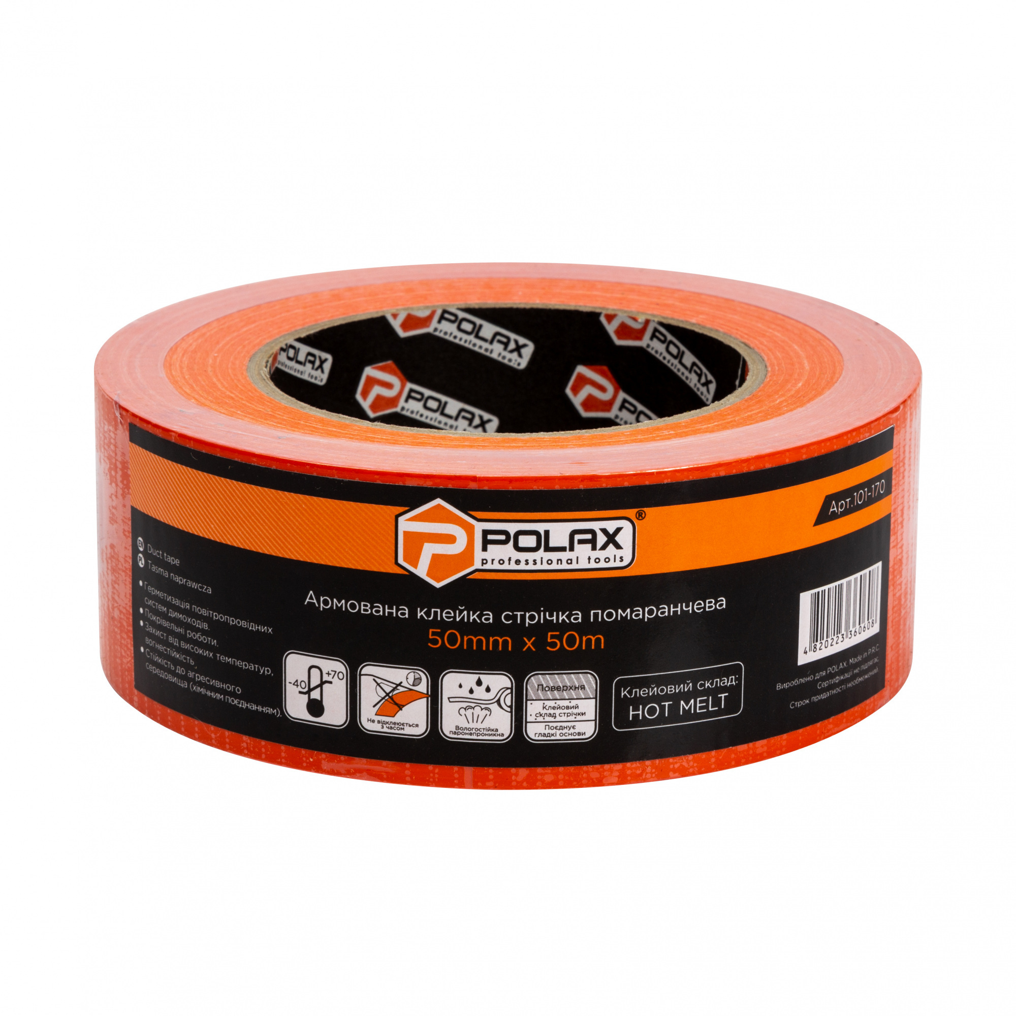 Армований скотч - універсальний вид будівельного скотчу, що відрізняється підвищеною міцністю, надійністю, еластичністю, ізоляційними та водонепроникними властивостями. Стрічку армовану можна використовувати при виконанні сантехнічних робіт Вона характеризується вологонепроникністю стійкістю до іржі і різних механічних навантажень Саме тому виріб відмінно підходить для герметизації труб, стикування швів і захисту повітряних каналів від вологості і води. У побуті клейка армована стрічка використовується для усунення пошкоджень на різних поверхнях. Виріб застосовується і при упаковці товарів, оскільки гарантовано захистить їх від потрапляння всередину вологи. Завдяки діелектричним властивостям стрічка армована відмінно підходить для ізоляції проводки, будівельних огорож, ремонту автомобілів і т. п. Стрічка армована складається з поліпропіленової основи, покритої клеєм з одного боку. Міцність виробу забезпечують тканинні волокна, які одночасно наділяють стрічку гнучкістю Незважаючи на складну технологію виготовлення, стрічка досить тонка, тому підходить для заклеювання навіть невеликих предметів і ділянок. Скотч армований Polax помаранчевий 50 мм х 50 м (101-170)