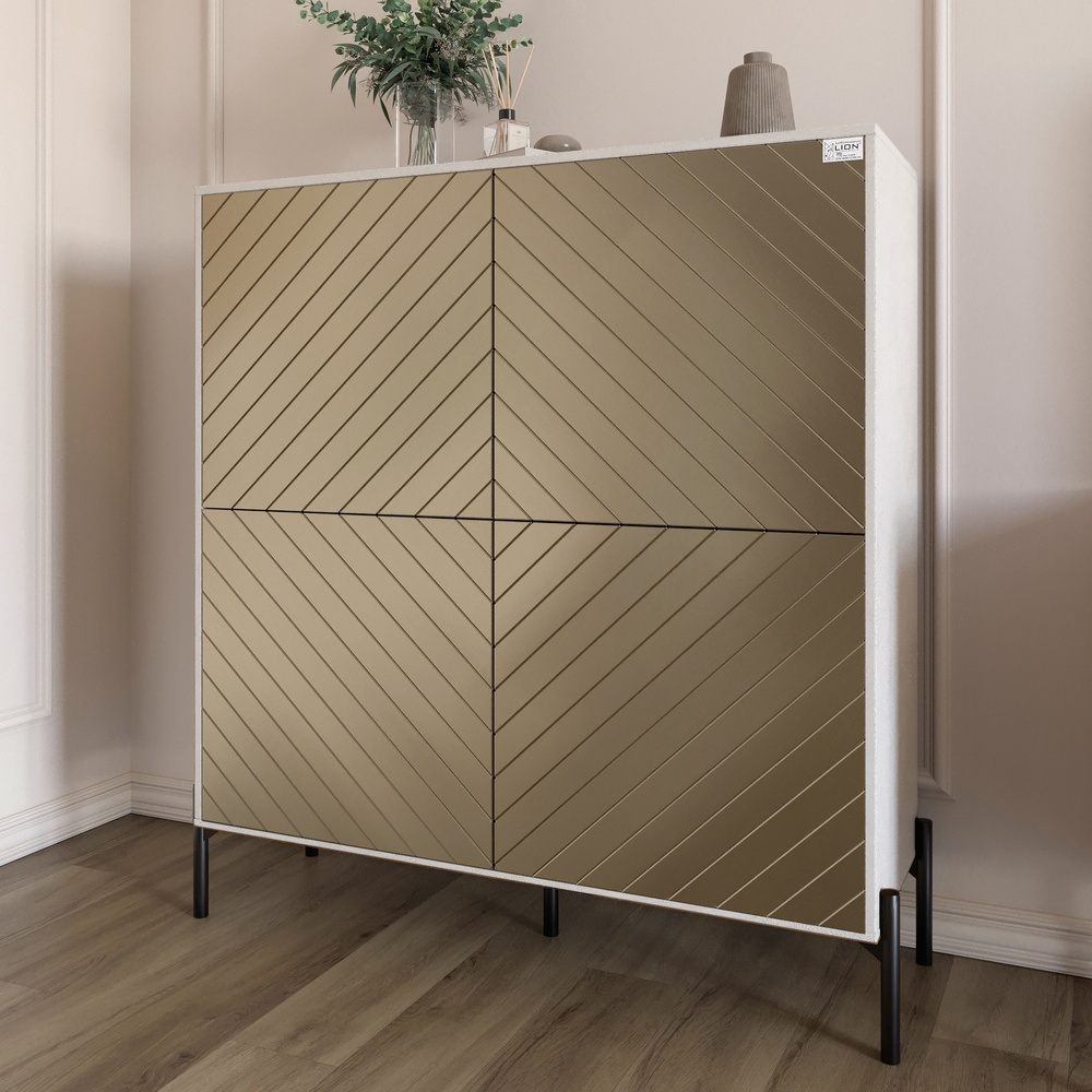 Комод-пенал LION Амарант Комод-пенал «Амарант» виготовлений із високоякісних матеріалів і чудово впишеться в інтер'єр у стилі сканді, мінімалізм, модерн або лофт. Його фасад прикрашений стильним діагональним візерунком, що створює візуальну динаміку та додає оригінальності. Металеві ніжки надають конструкції легкість і забезпечують стійкість. Комод оснащений компактними, але місткими секціями, які дають змогу організувати зберігання різних речей, від одягу до документів. Цей комод стане стильним акцентом вашого простору, поєднуючи практичність і естетичну привабливість. Матеріал виготовлення Комод виготовлений з ЛДСП SWISS KRONO - високоякісного матеріалу, що поєднує естетику з міцністю і надійністю. ЛДСП від SWISS KRONO відомий своєю стійкістю до механічних пошкоджень, вологи та високих температур, що гарантує довговічність меблів і зберігає їхній естетичний вигляд на довгі роки. Ніжки комода виготовлені з металу. Особливості 2 відділення з полицями- забезпечують максимальний комфорт у використанні і дозволяють зберігати різні речі в організованому порядку. Комод пропонує достатньо місця для зберігання білизни, аксесуарів та інших предметів. Мінімалістична фурнітура - дверцята відчиняються легко і плавно, що відповідає концепції мінімалізму, без зайвих ручок або видимої фурнітури. Діагональний візерунок фасадів - сучасний і стильний дизайн з унікальним геометричним малюнком у вигляді «ялинки» підкреслює вишуканість меблів і додає динаміки в інтер'єр. Кромка 2 мм - захищає краї виробів від пошкоджень, надає їм естетично завершеного вигляду та підвищує довговічність меблів. Кромку виготовляють із міцних матеріалів, що дає змогу їй витримувати інтенсивне використання і зберігати привабливий зовнішній вигляд упродовж багатьох років. Розміри: Ширина: 1140 мм Глибина: 400 мм Висота: 1265 мм