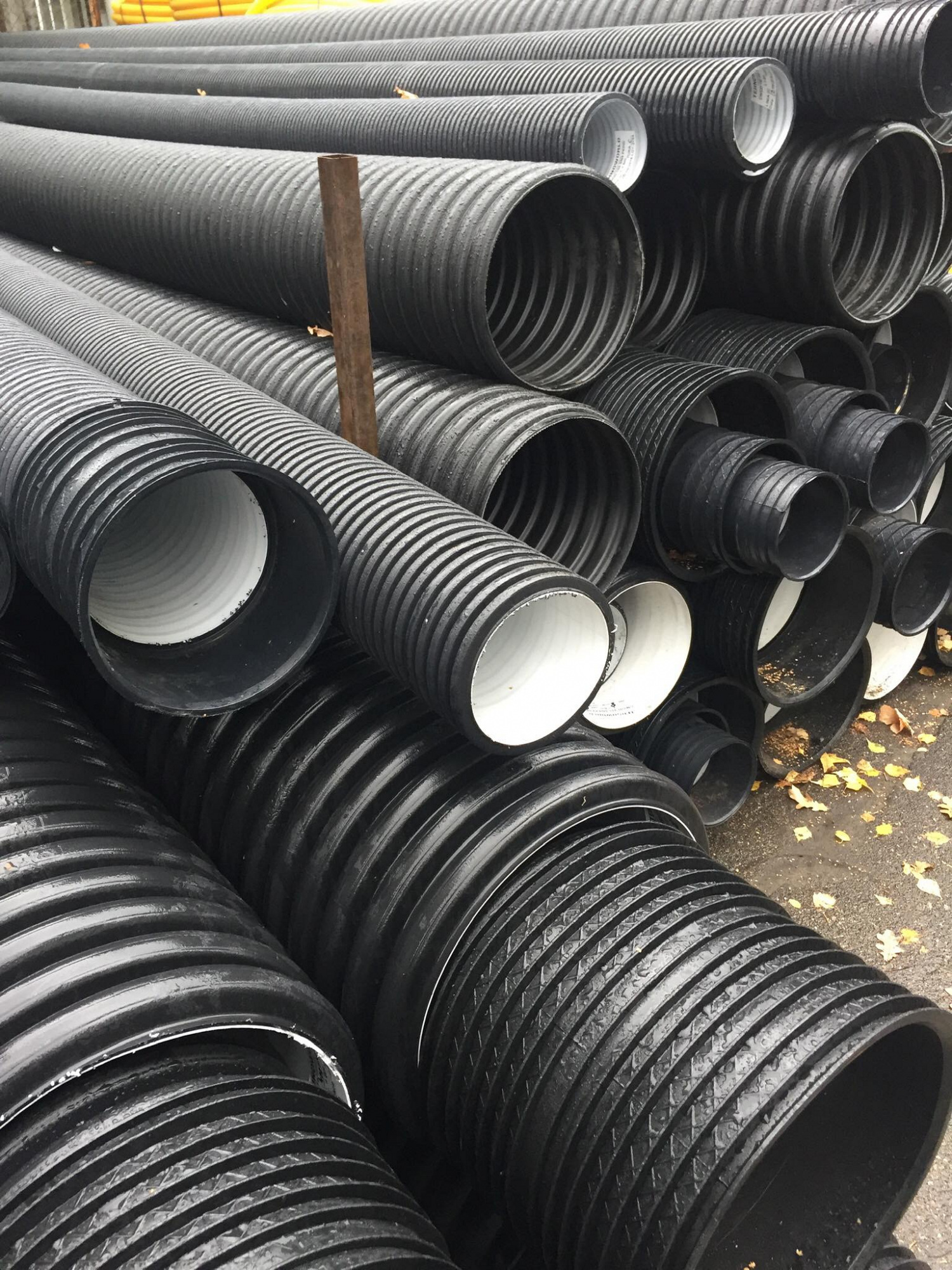Для будівництва дренажних трубопроводів пропонуємо труби у відрізках по 6 метрів, діаметрами 110 мм, 160 мм, 200 мм та 315 мм. Відпускаються вони в комплекті з муфтою та двома кільцями ущільнювачів.