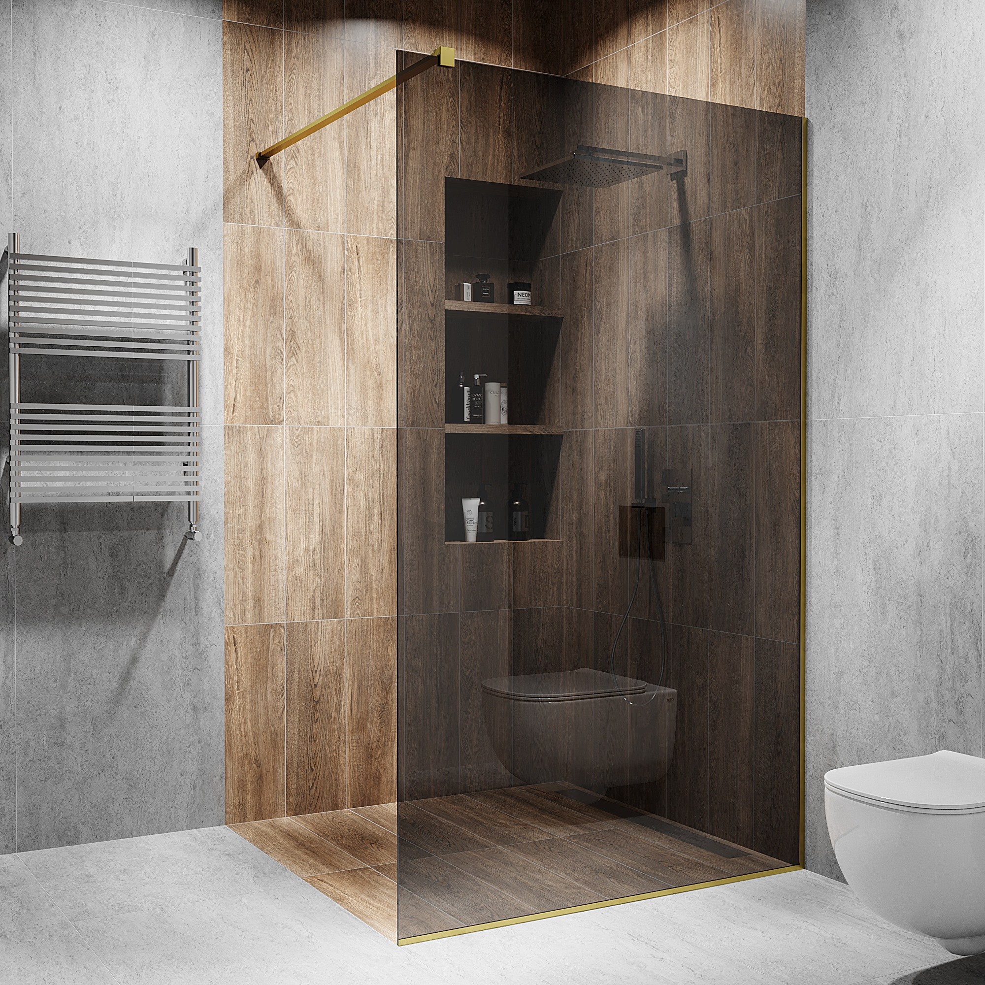 Опис Скляна душова перегородка 2000х900мм. скло: графіт, колір фурнітури: Gold - Золото поліроване