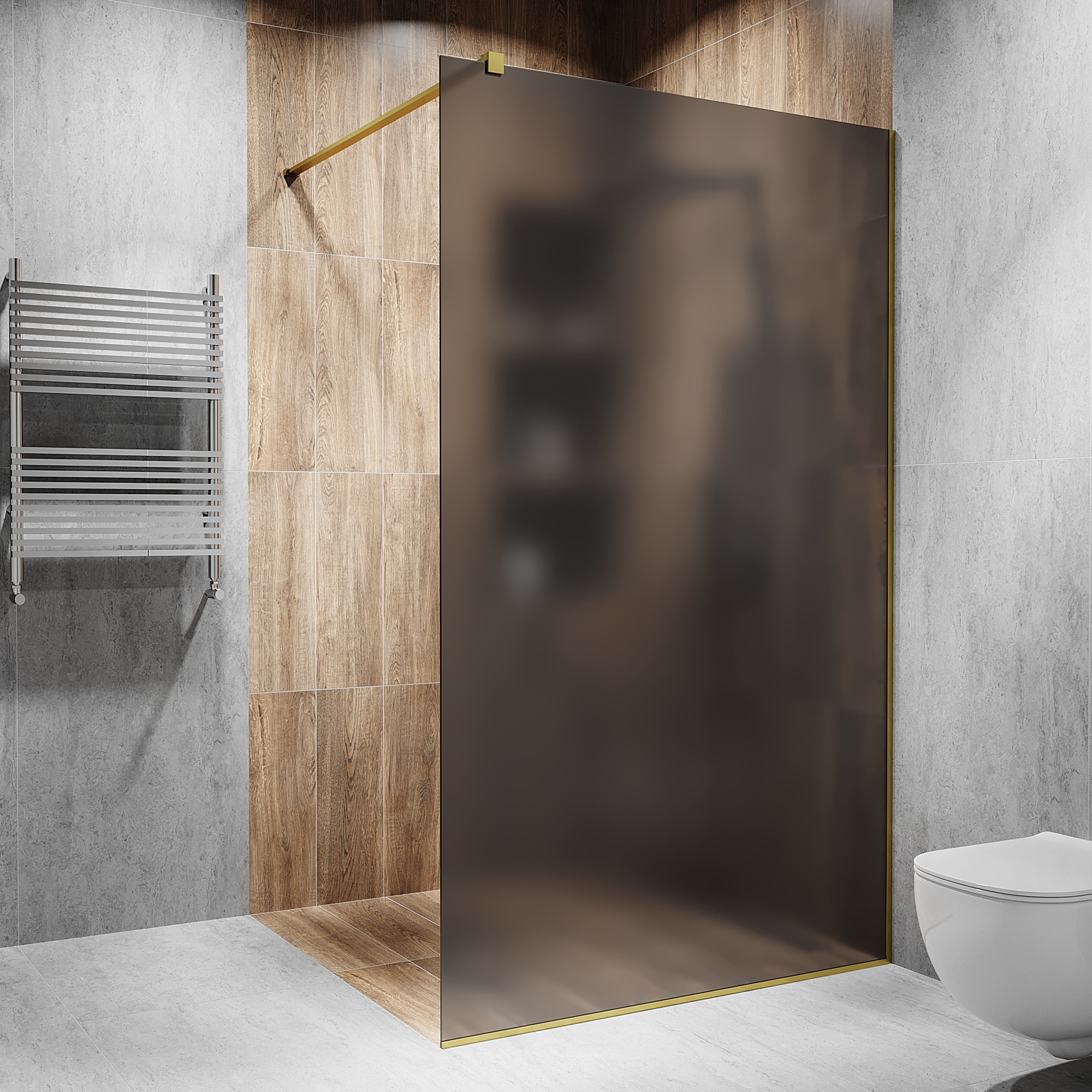 Опис Скляна душова перегородка 2000х1200мм. скло: графіт, матове, колір фурнітури: Gold - Золото поліроване