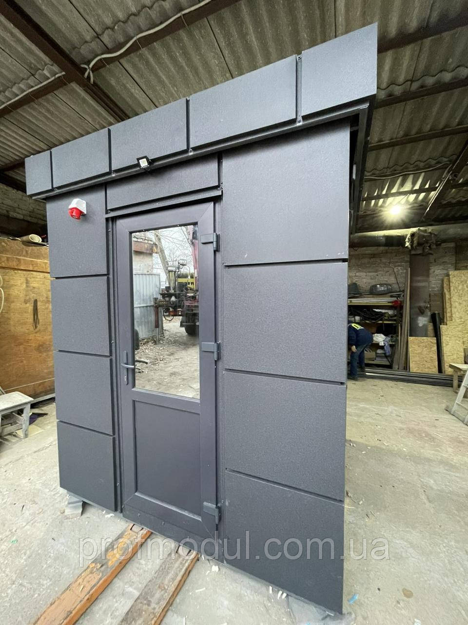 Основною "ізюмінкою" цього поста охорони є його зовнішнє оздоблення - фасадні касети в кольорі "графіт" Та тоновані склопакети з триплексом. Віконні рами також з зовнішньою ламінацією в колір "графіт". Вікна в три сторони + склопакет в верхній частині дверей. Внутрішнє оздоблення - ЛДСП. Утеплення 100 мм базальтова вата. Каркас металевий зварний.