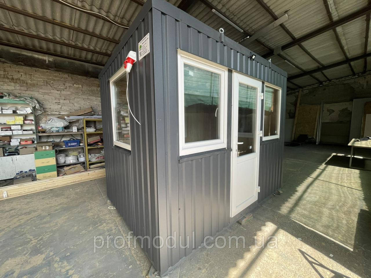 Вікна в три сторони + склопакет в верхній частині дверей. Повний огляд в 360 градусів Зовнішнє оздоблення профлист колір "графіт" Внутрішнє оздоблення - ЛДСП. Утеплення 100 мм базальтова вата. Каркас металевий зварний.