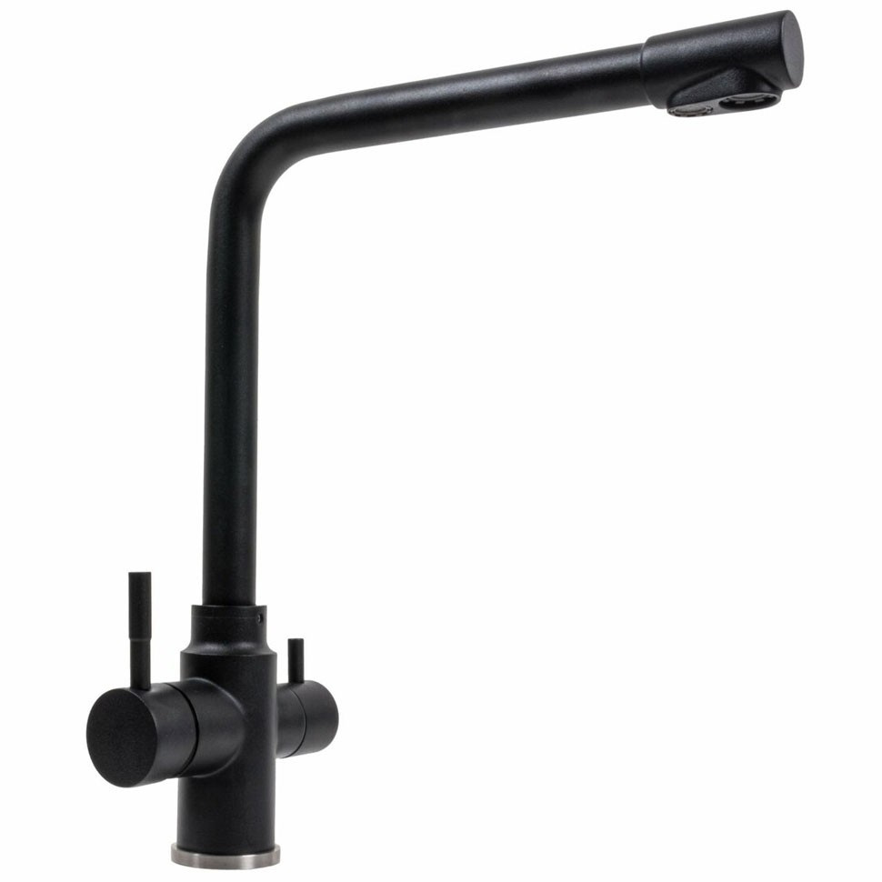 Змішувач для кухні Platinex KT 8201 в кольорі «чорно матовому» - це універсальне і практичне рішення для тих, хто використовує системи очищення води. наявність окремого каналу і додаткового виливу для подачі очищеної води, що підключається безпосередньо до фільтра або системи зворотного осмосу. Це дозволяє використовувати один змішувач як для звичайної водопровідної води, так і для питної, без необхідності встановлювати додатковий кран. одна регулює подачу гарячої та холодної води, друга – подачу фільтрованої.