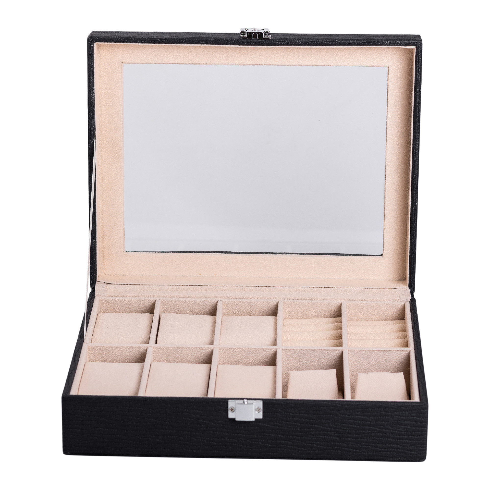 Органайзер має 10 відсіків з велюровим оздобленням, завдяки чому можна організувати прикраси з різних дорогоцінних металів, біжутерію, годинник у задуманому власником порядку. Внутрішнє оздоблення відмінно підходить для перлів, каменів та різних синтетичних матеріалів, які використовуються як вставки для аксесуарів.
