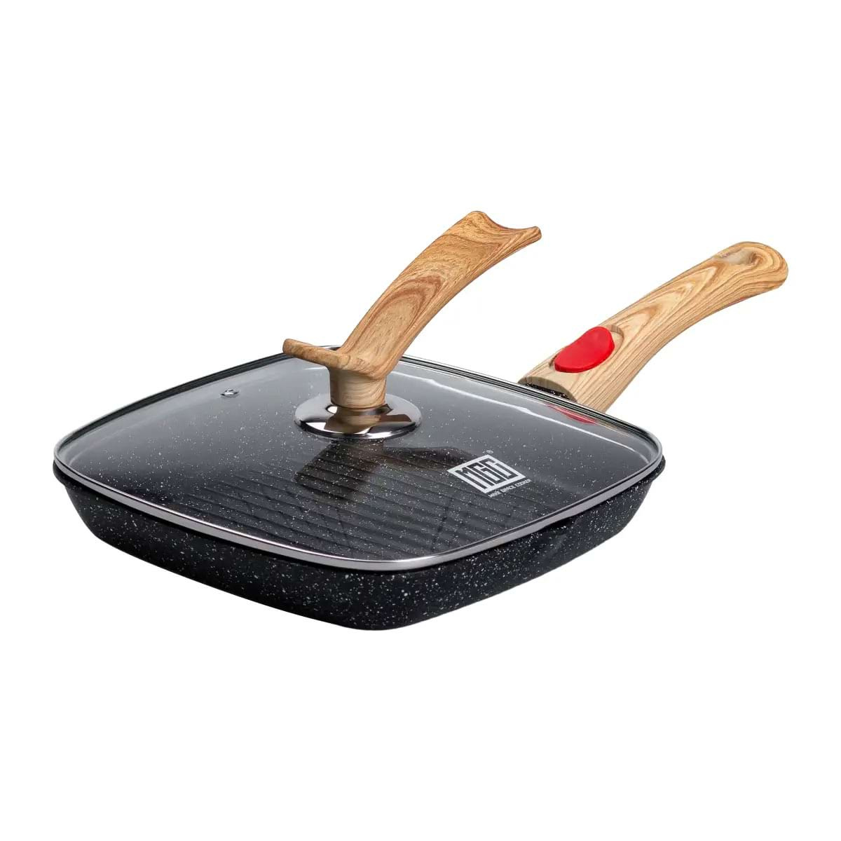 Посуд має потовщене дно, яке рівномірно нагрівається, а прямокутна форма є найбільш функціональною та дозволяє раціонально використовувати всю робочу поверхню. З боків сковороди є спеціальні носики для зливу надлишків жиру або рідини, а скляна кришка з отвором для виходу пари запобігає розбризкуванню. Рекомендації щодо використання: Перед першим використанням сковороду слід вимити теплою водою з використанням м'яких миючих засобів і витерти насухо. Після цього протерти робочу поверхню звичайною серветкою з невеликою кількістю рослинної олії. Для миття після використання не слід застосовувати жорсткі мочалки, скребки, абразивні та агресивні речовини.