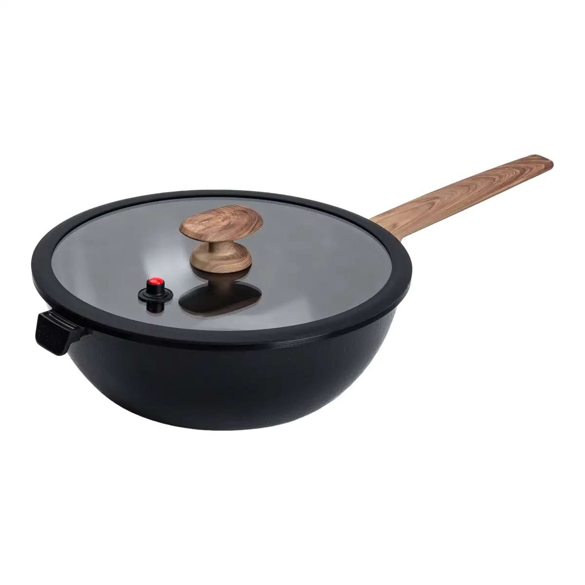 Сковорода ВОК діаметром 30 см - універсальний інструмент для приготування страв східної кухні, рагу, пасти та багато іншого. Сковорода виготовлена з литого алюмінію, має товсте дно, що забезпечує рівномірне прогрівання та зниження часу на приготування їжі. Крім того, швидке обсмажування дає можливість зберегти смак та корисні речовини овочів, м'яса та морепродуктів, а високі стінки та широке дно ідеально підходять для легкого перемішування та великих об'ємів їжі. Сковорода має антипригарне покриття, що дозволяє готувати з мінімальною кількістю тваринних та рослинних жирів.